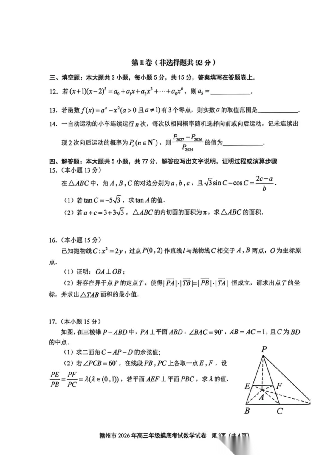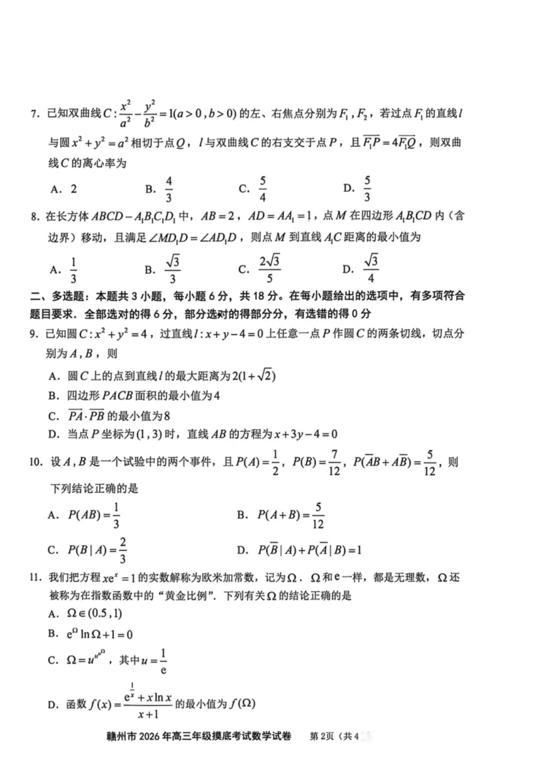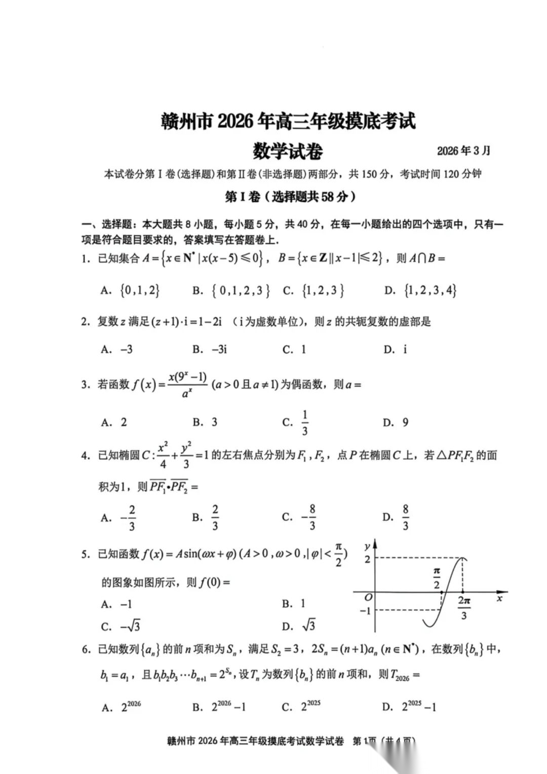 【全科】江西省赣州市2026年高三年级下学期摸底考试