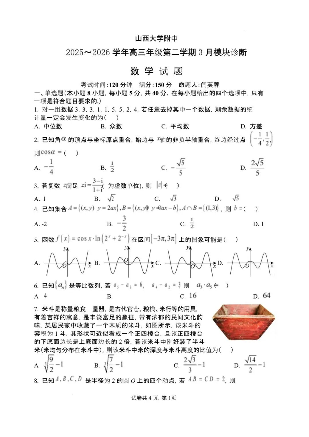 【超清无水印】:高三,山西大学附属中学校2025-2026学年高三年级第二学期3月模块诊断