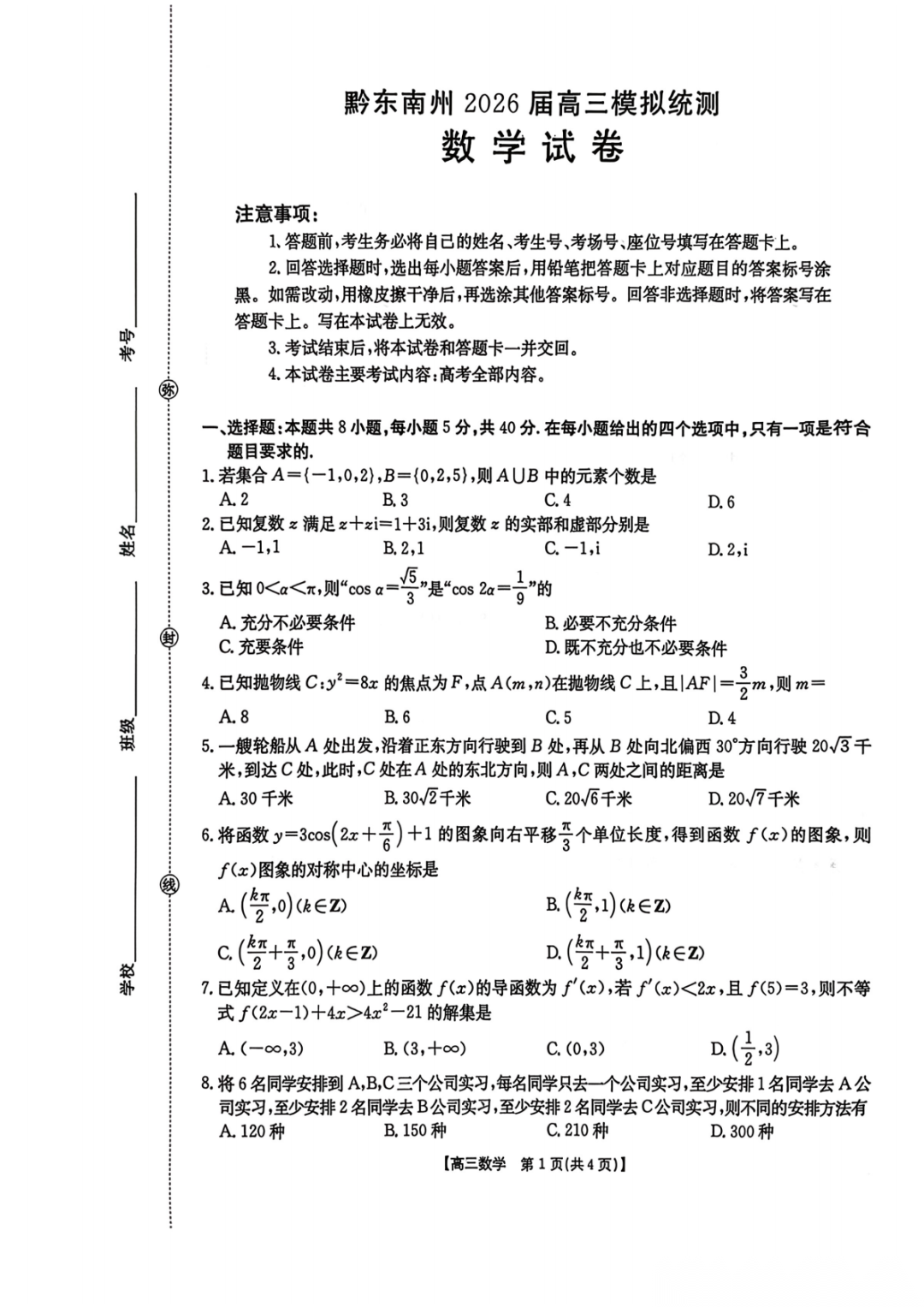 【黔东南一模全科】黔东南州2026届高三模拟统测