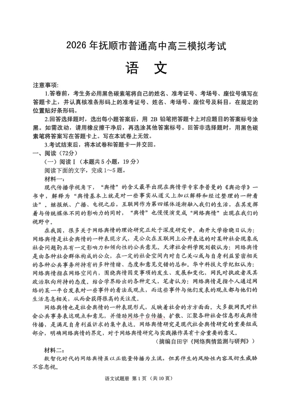 【抚顺一模】2026年抚顺市高三3月模拟考试