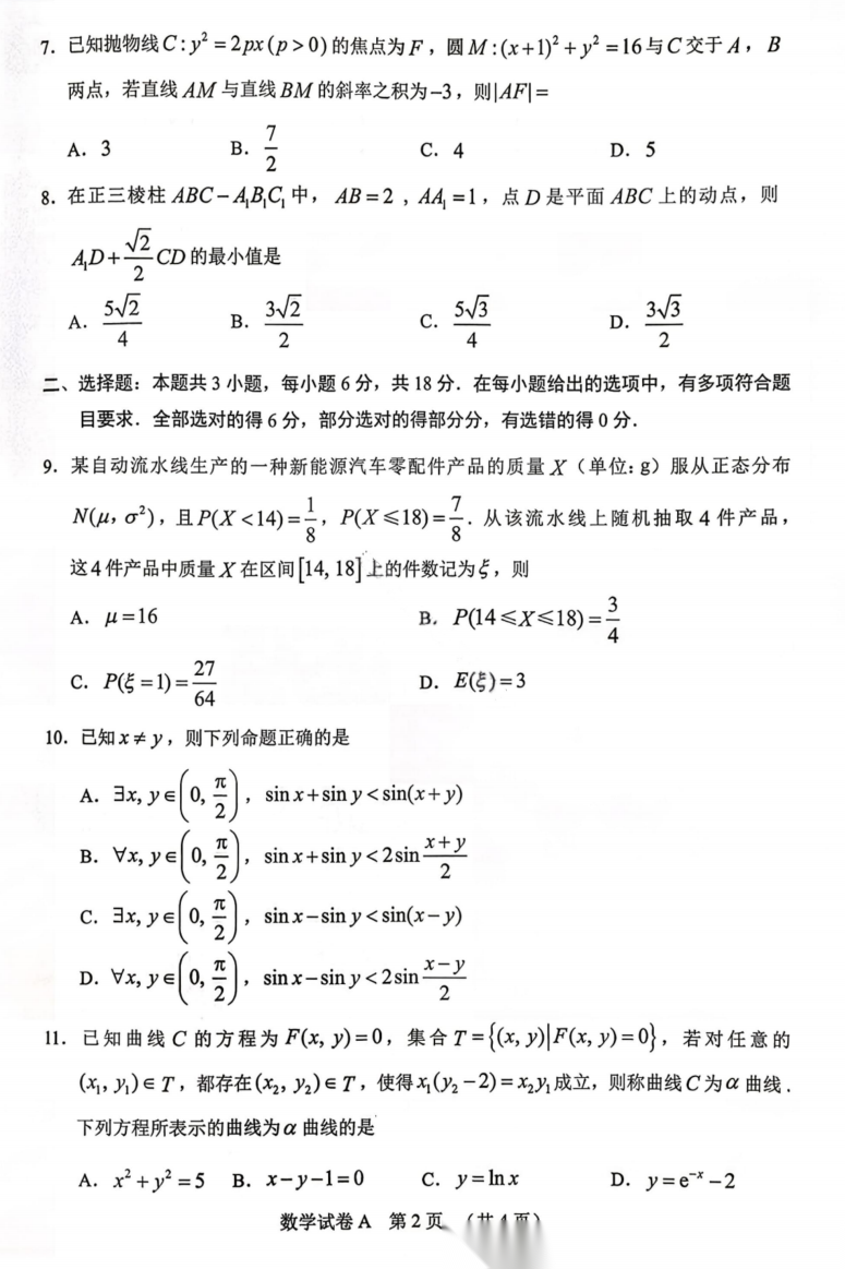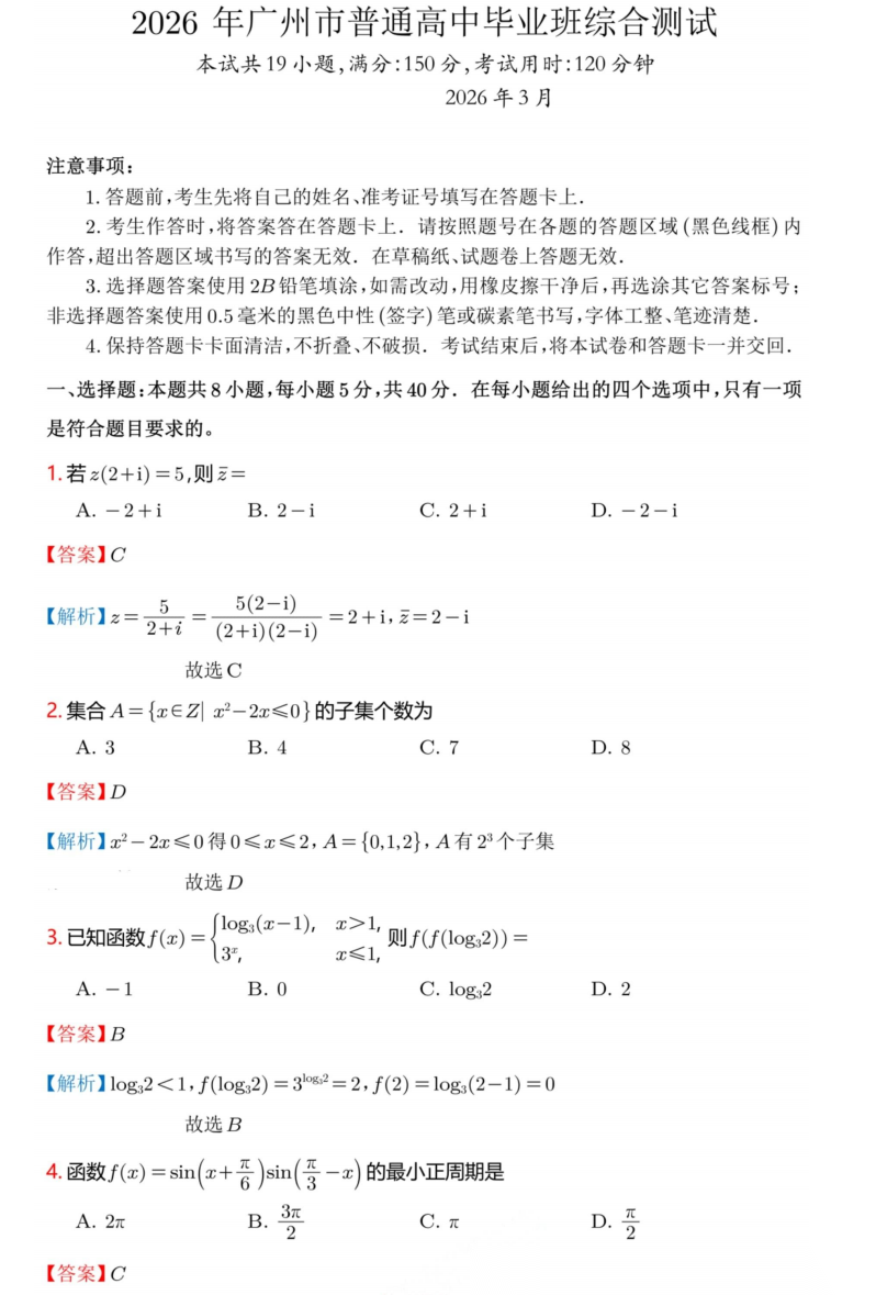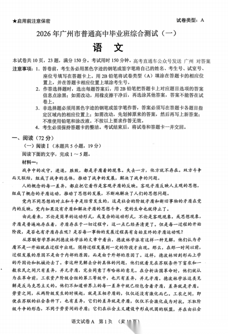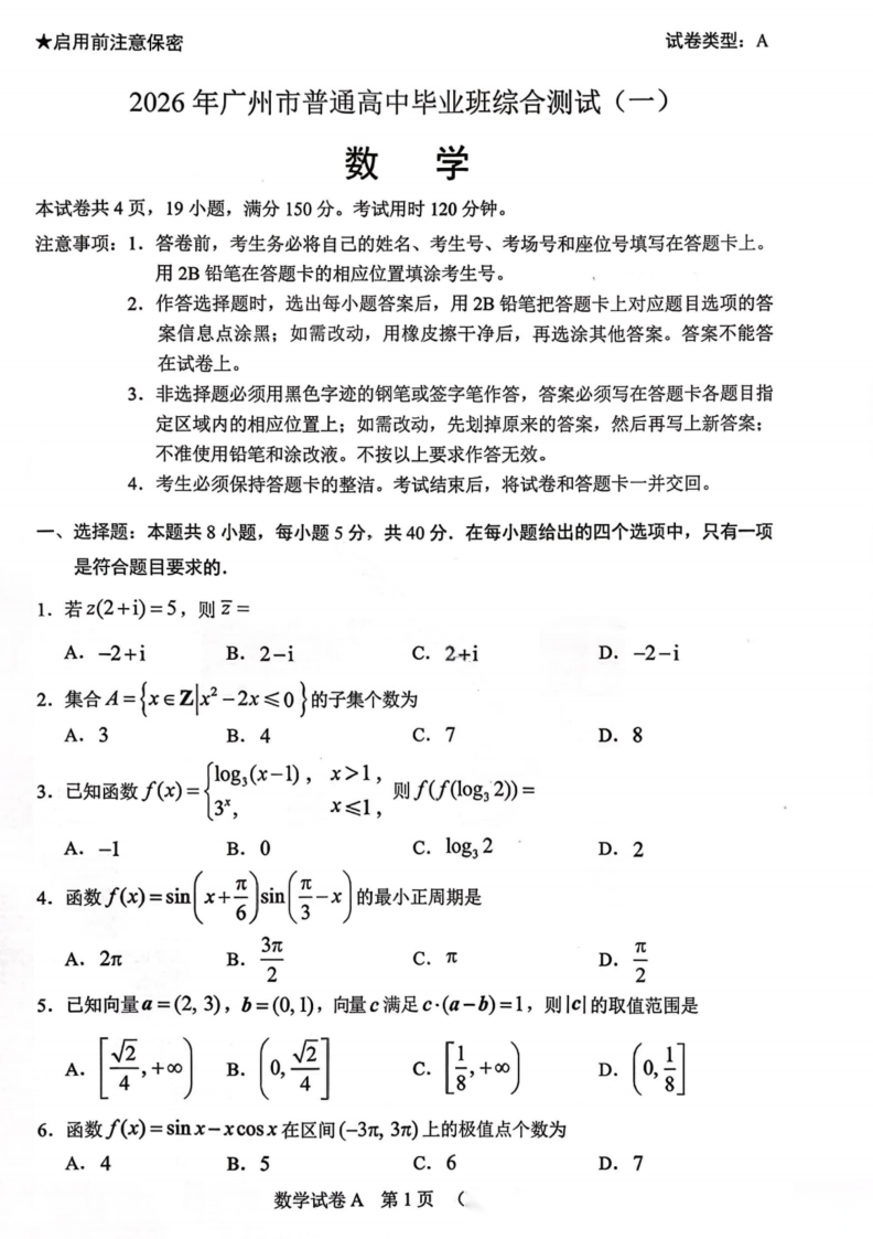 【广东卷】广东省广州市2026年广州市普通高中毕业班综合测试(一)(广州一模)(3.17-3.19) 数学语文试题卷+答案