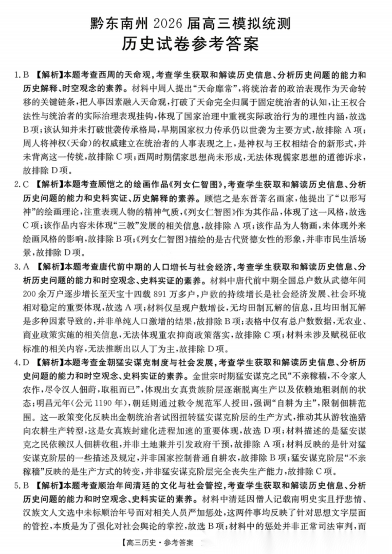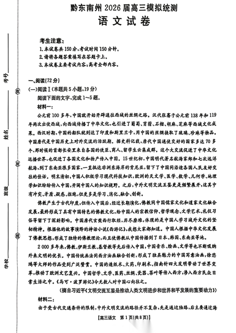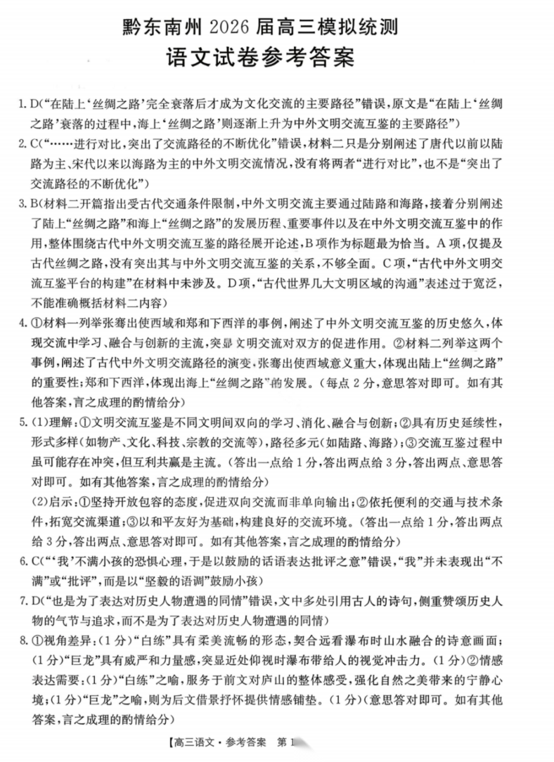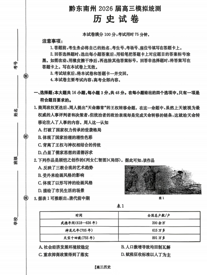 【贵州卷】贵州省黔东南州2026届高三年级3月模拟统测(3.16-3.17) 数学物理语文历史试题卷+答案