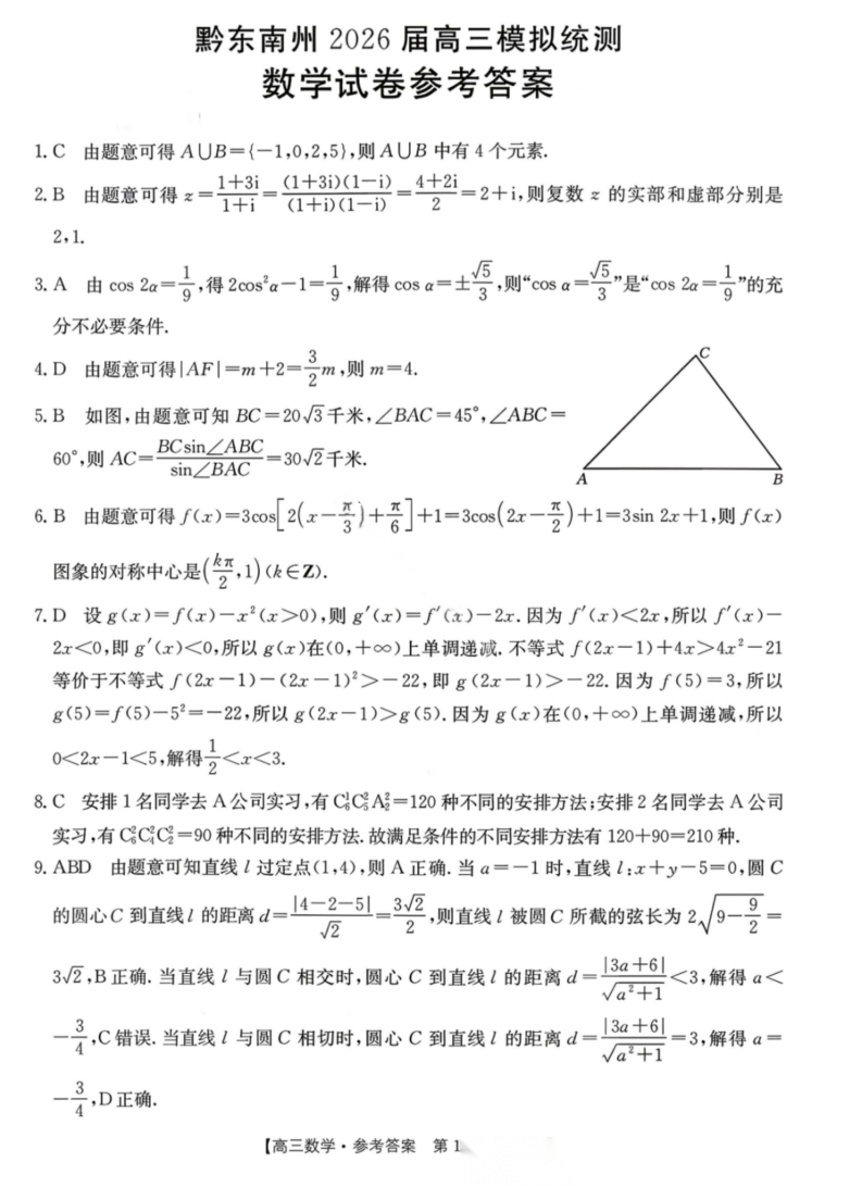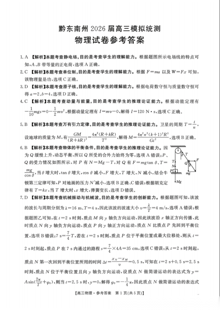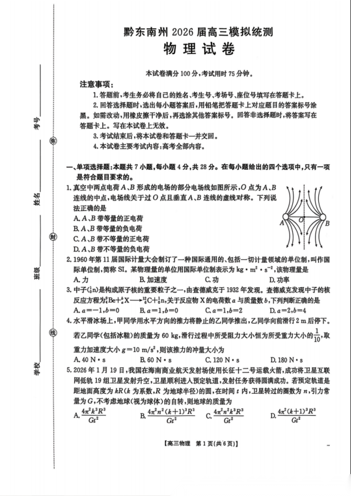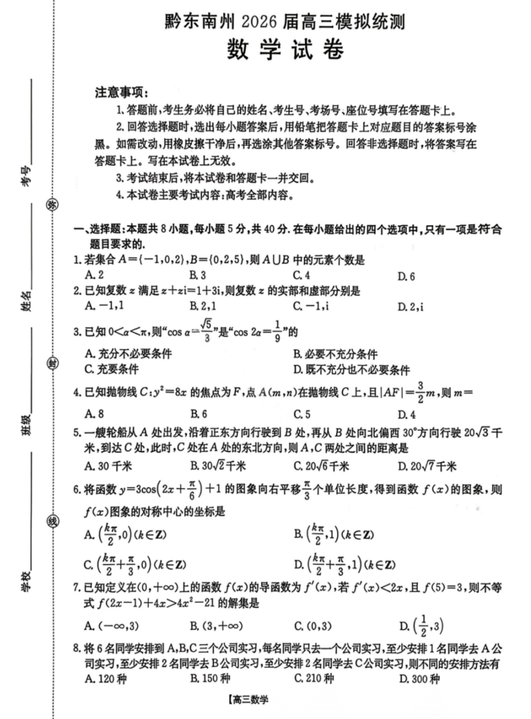 【贵州卷】贵州省黔东南州2026届高三年级3月模拟统测(3.16-3.17) 数学物理语文历史试题卷+答案