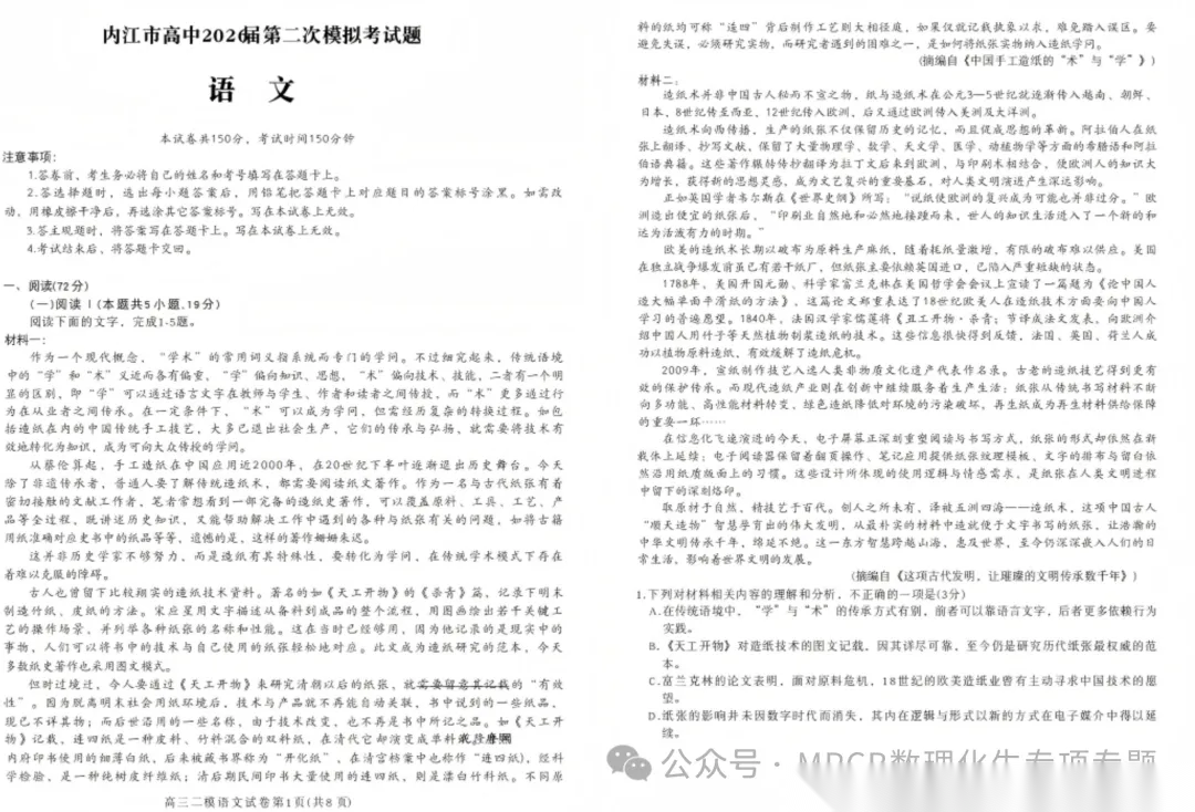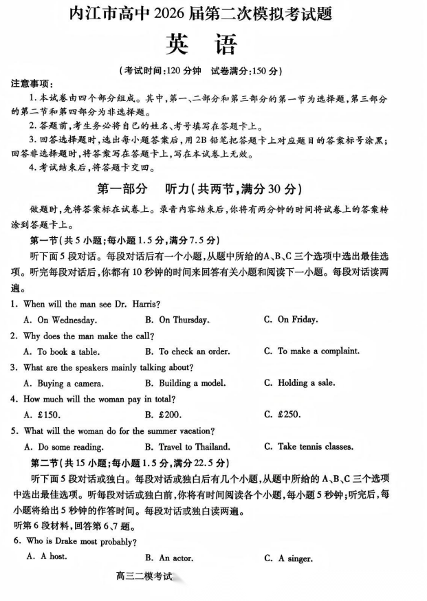 【四川卷】四川省内江市2026届高三年级第二次模拟考试试题(内江二诊)(3.16-3.18) 数学语文英语试题卷+答案