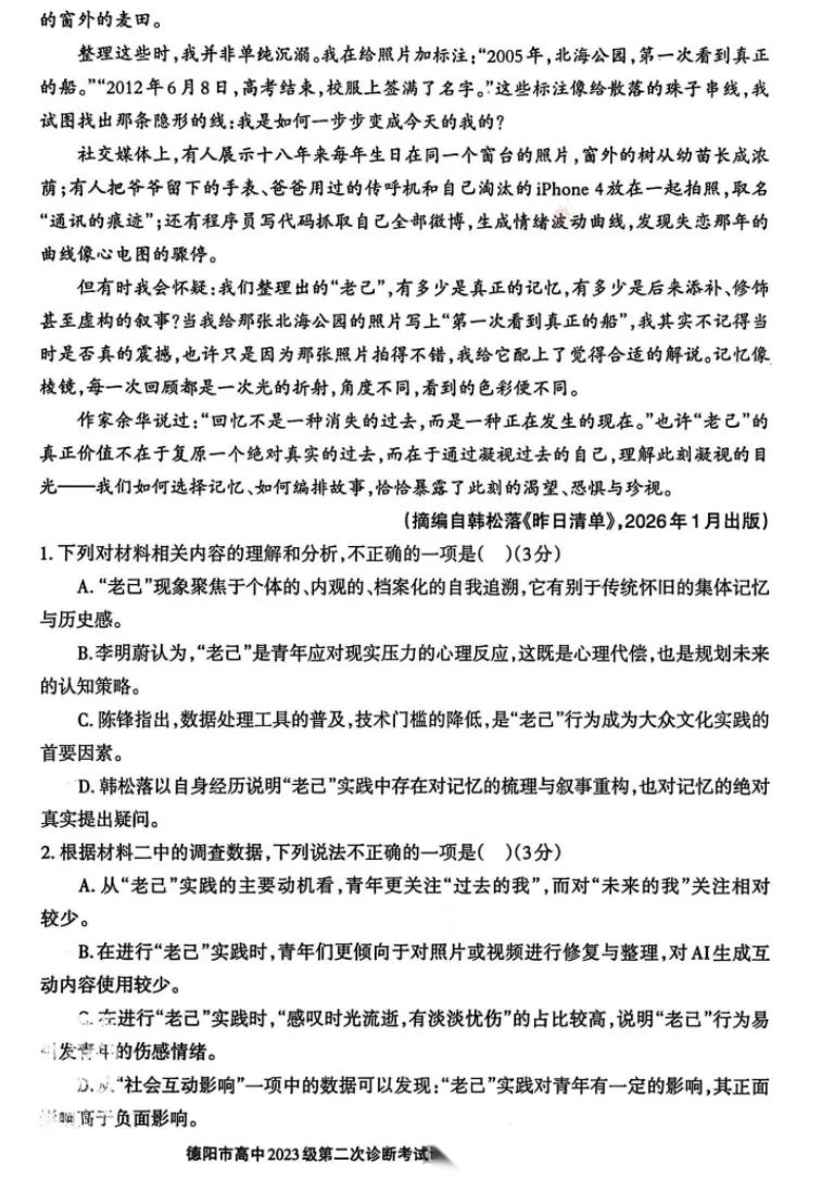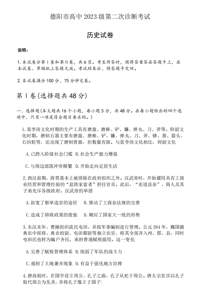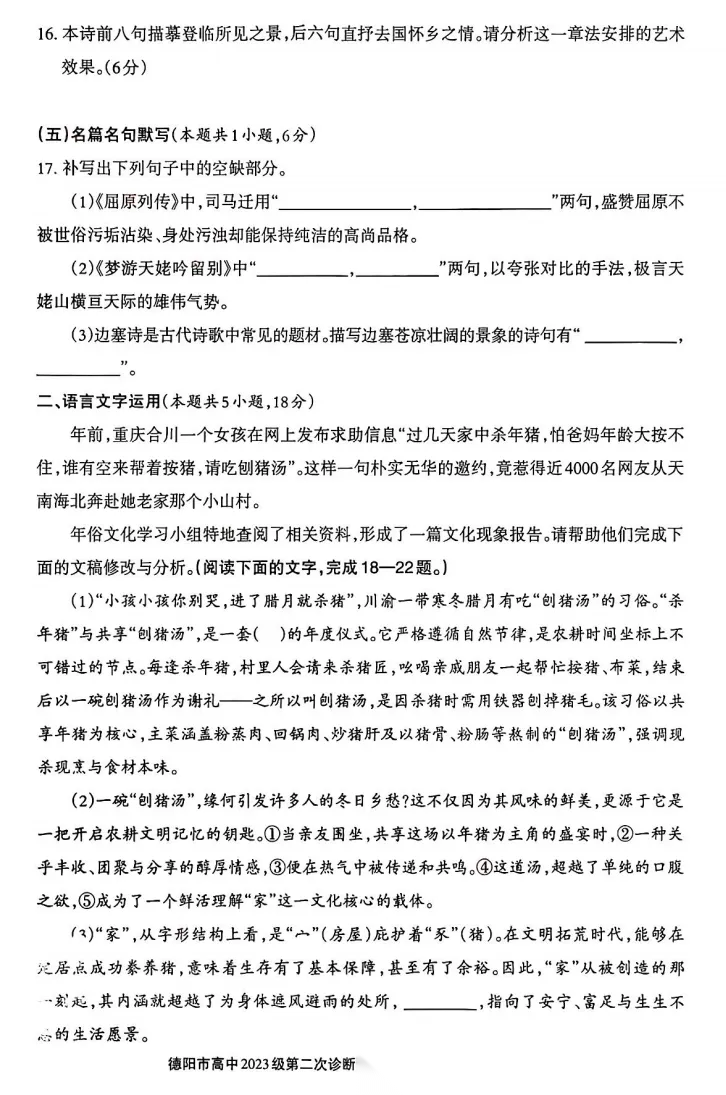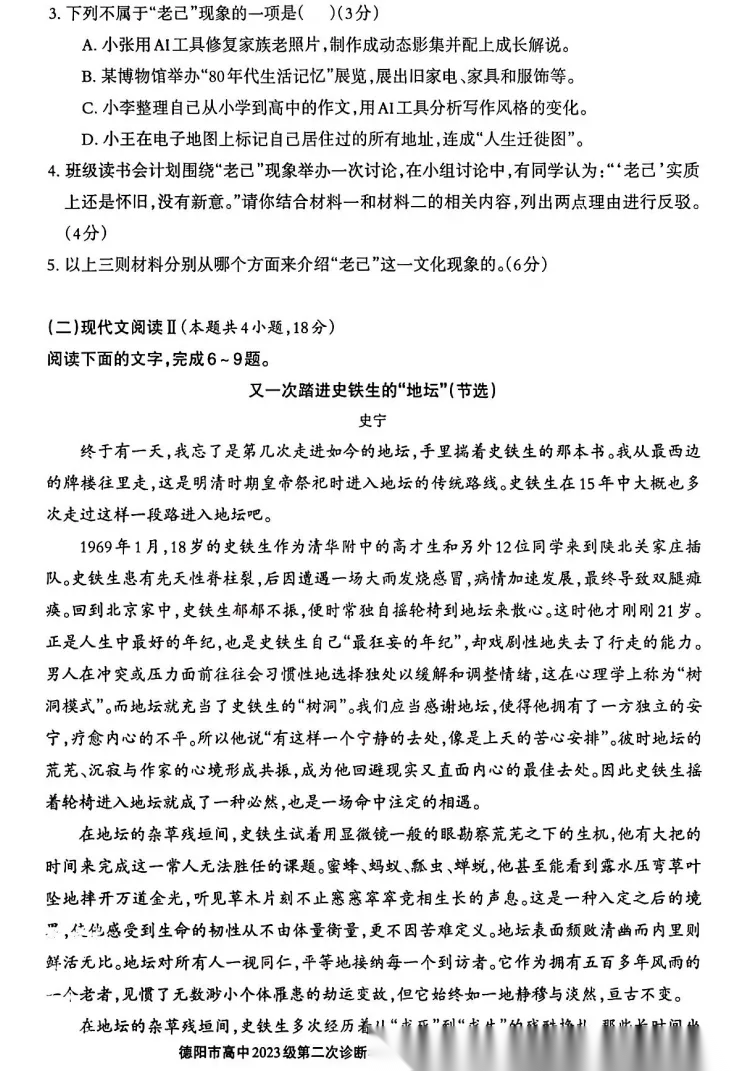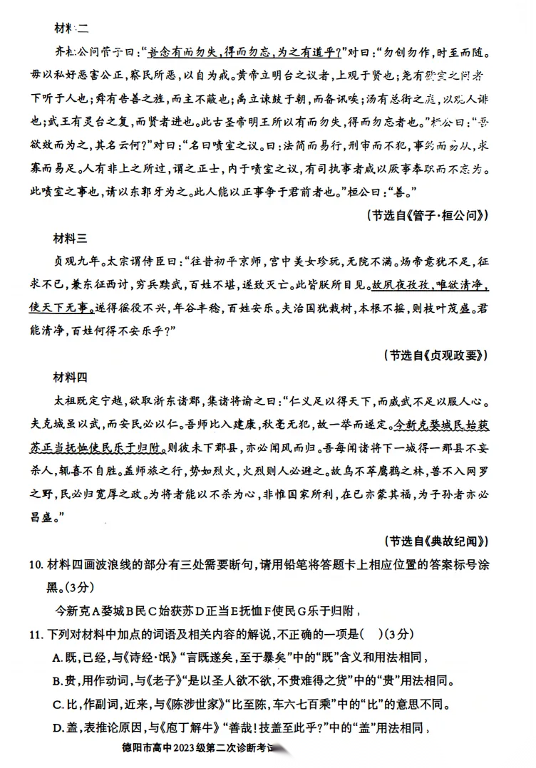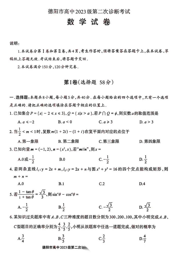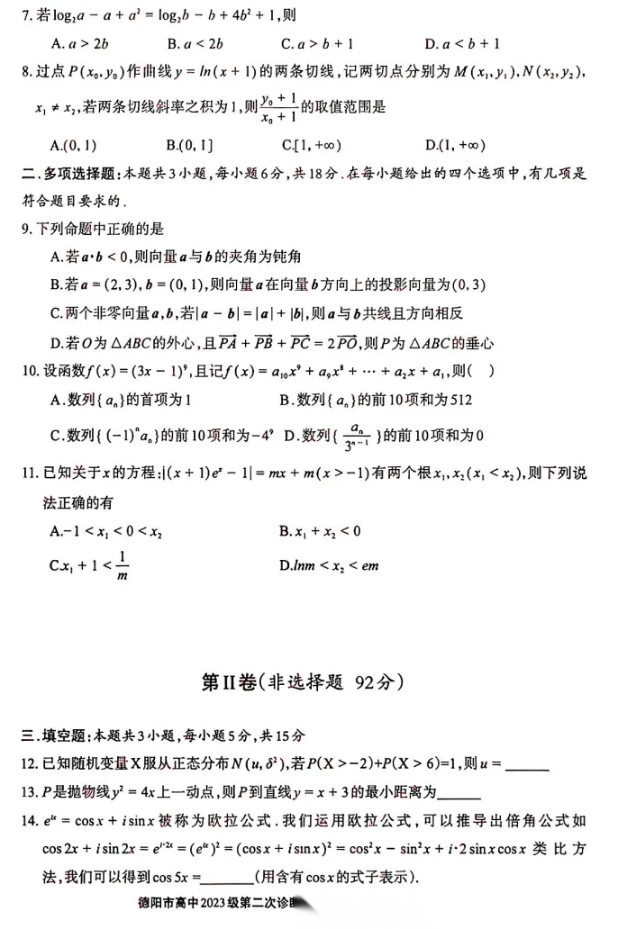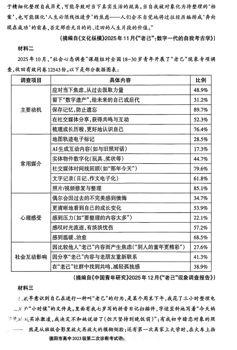 【四川卷】四川省德阳市2023级(2026届)高三年级第二次诊断考试(德阳二诊)(3.16-3.18) 数学语文历史试题卷+答案