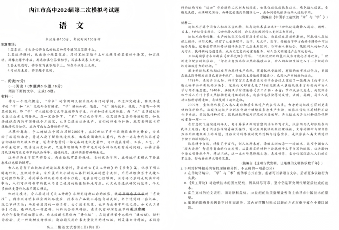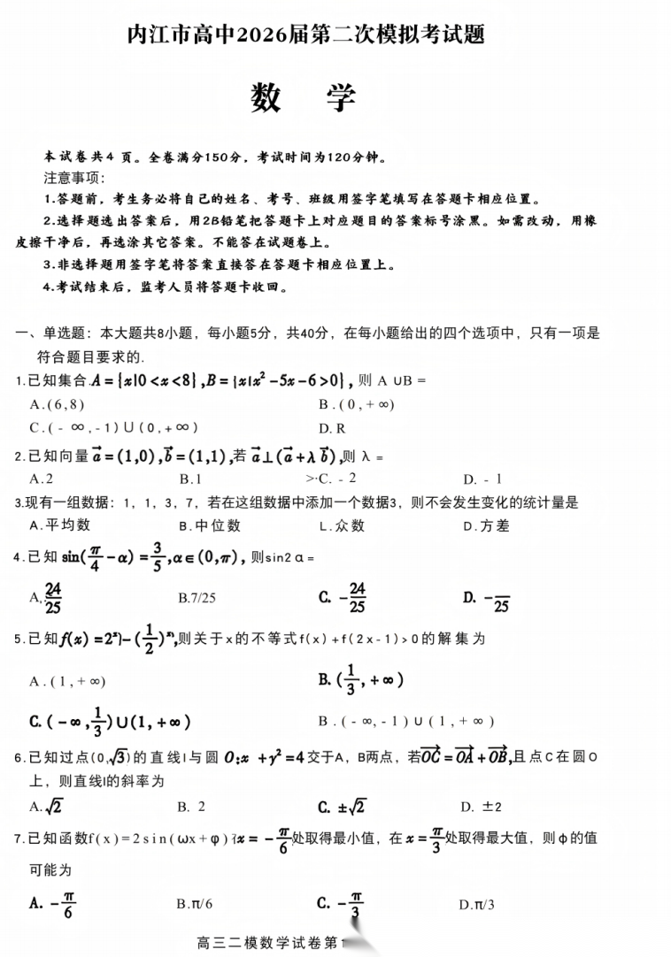 【四川卷】四川省内江市2026届高三年级第二次模拟考试试题(内江二诊)(3.16-3.18) 全科试题卷+答案