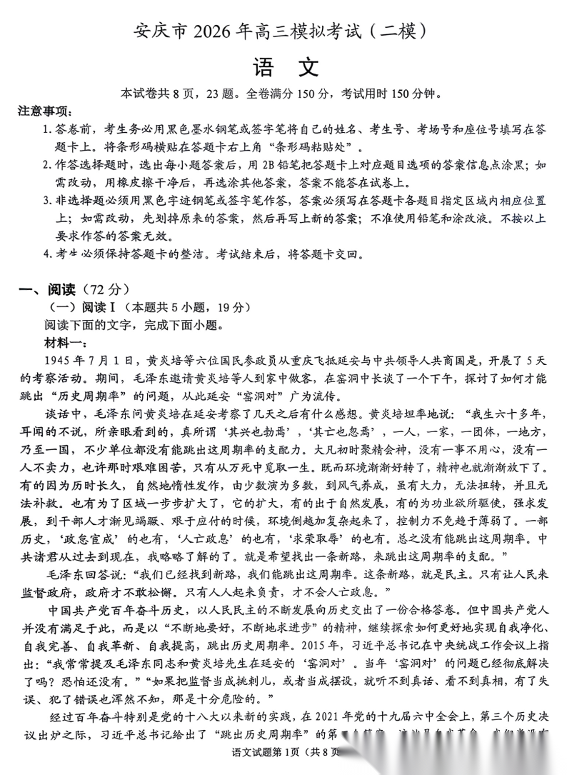 【安庆二模】安庆市2026年高三3月模拟考试答案
