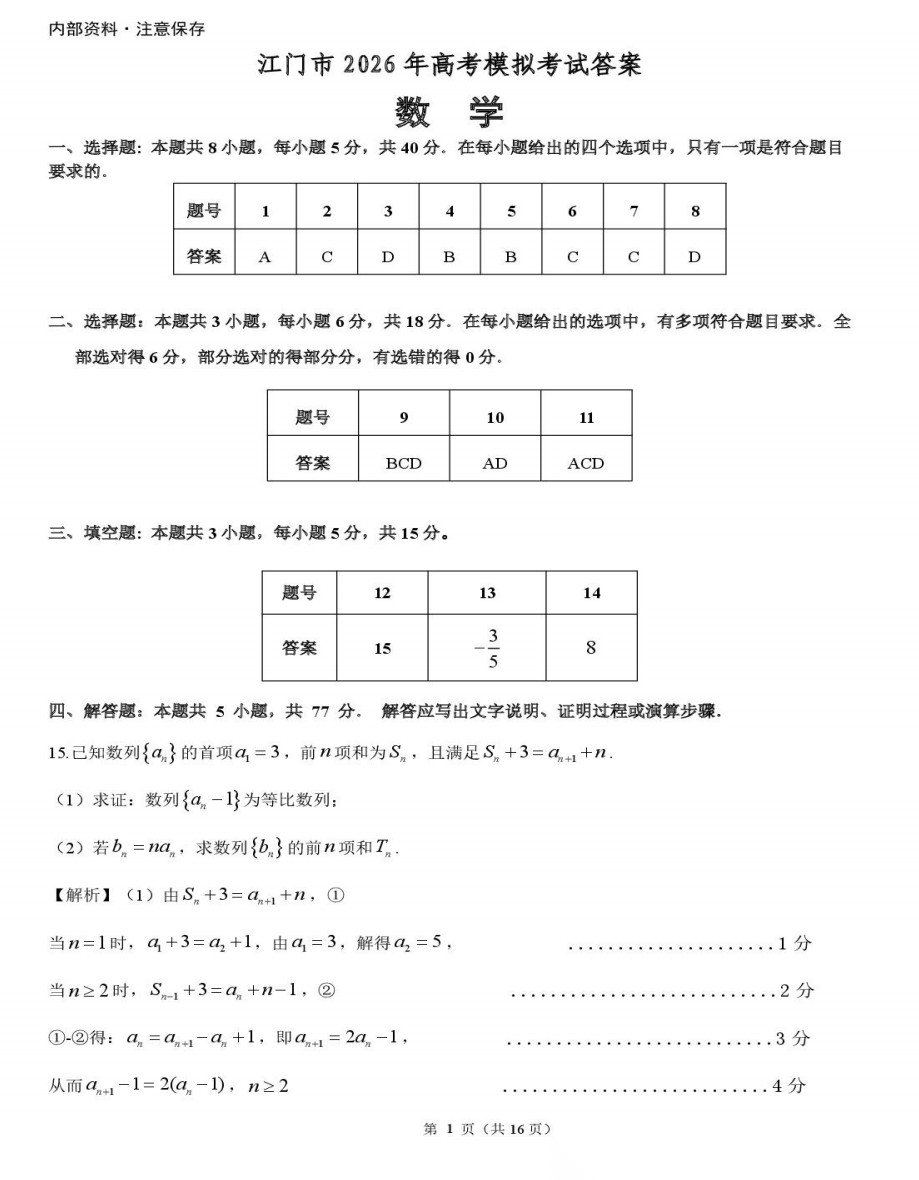 【江门一模】广东省江门市2026年高考模拟考试答案 【江门一模】广东省江门市2026年高考模拟考试答案