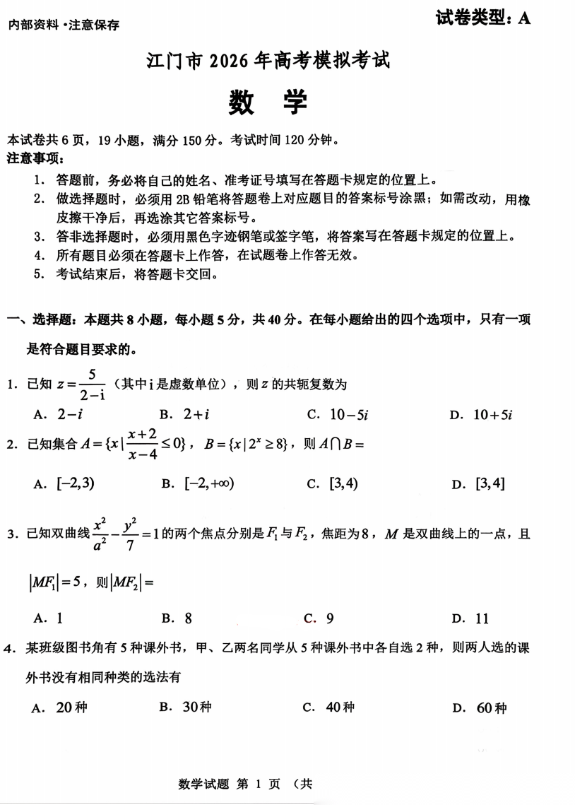 【广东卷】广东省江门市2026年3月高三年级高考模拟考试(江门一模)(3.18-3.20) 数学语文试题卷+答案
