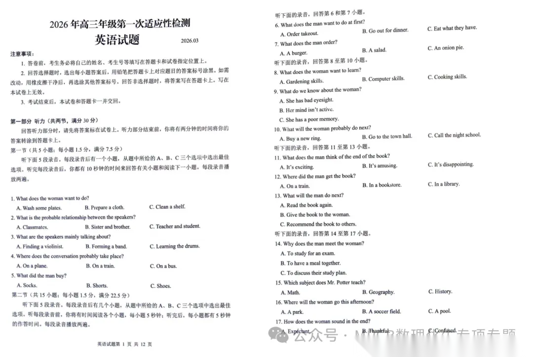 【黑吉辽蒙卷】辽宁省2026年抚顺市普通高中应届毕业生高三年级高考模拟考试(抚顺一模)(3.17-3.19)数学物理英语语文历史试题卷+答案 【黑吉辽蒙卷】辽宁省2026年抚顺市普通高中应届毕业生高三年级高考模拟考试(抚顺一模)(3.17-3.19)数学物理英语...