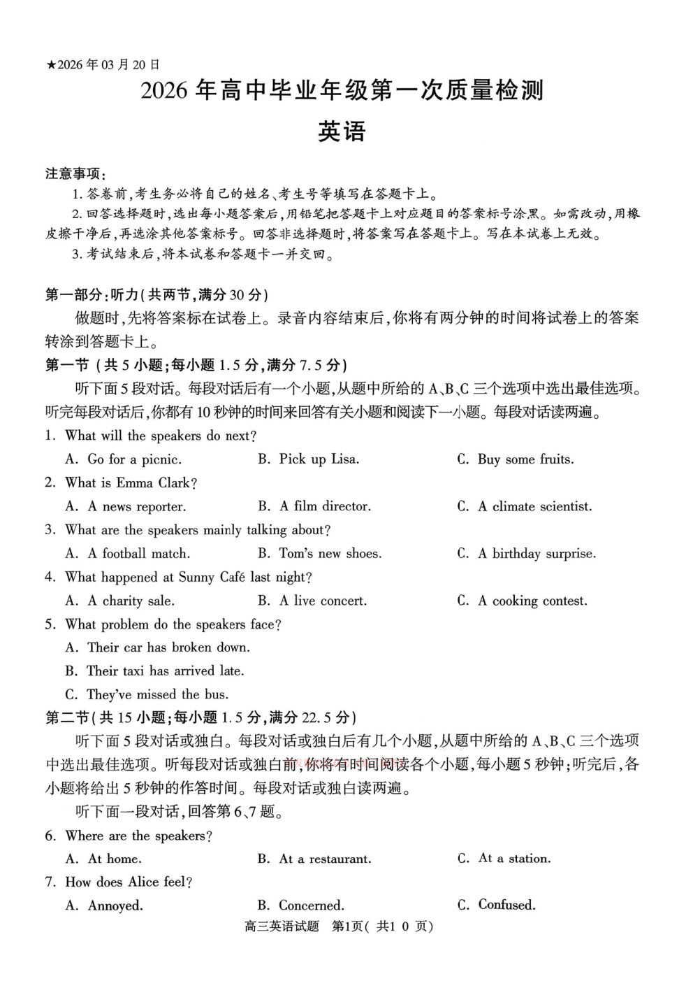 【南昌一模】南昌2026届高三年级三月测试全科下载 【南昌一模】南昌2026届高三年级三月测试全科下载