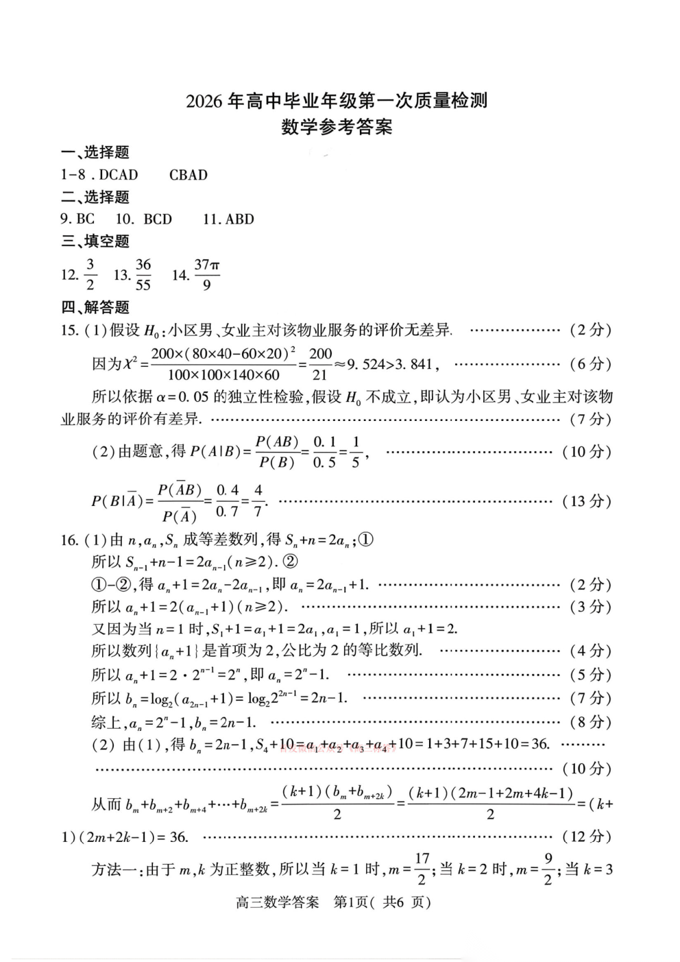 2026河南五市高三第一次模拟考试答案