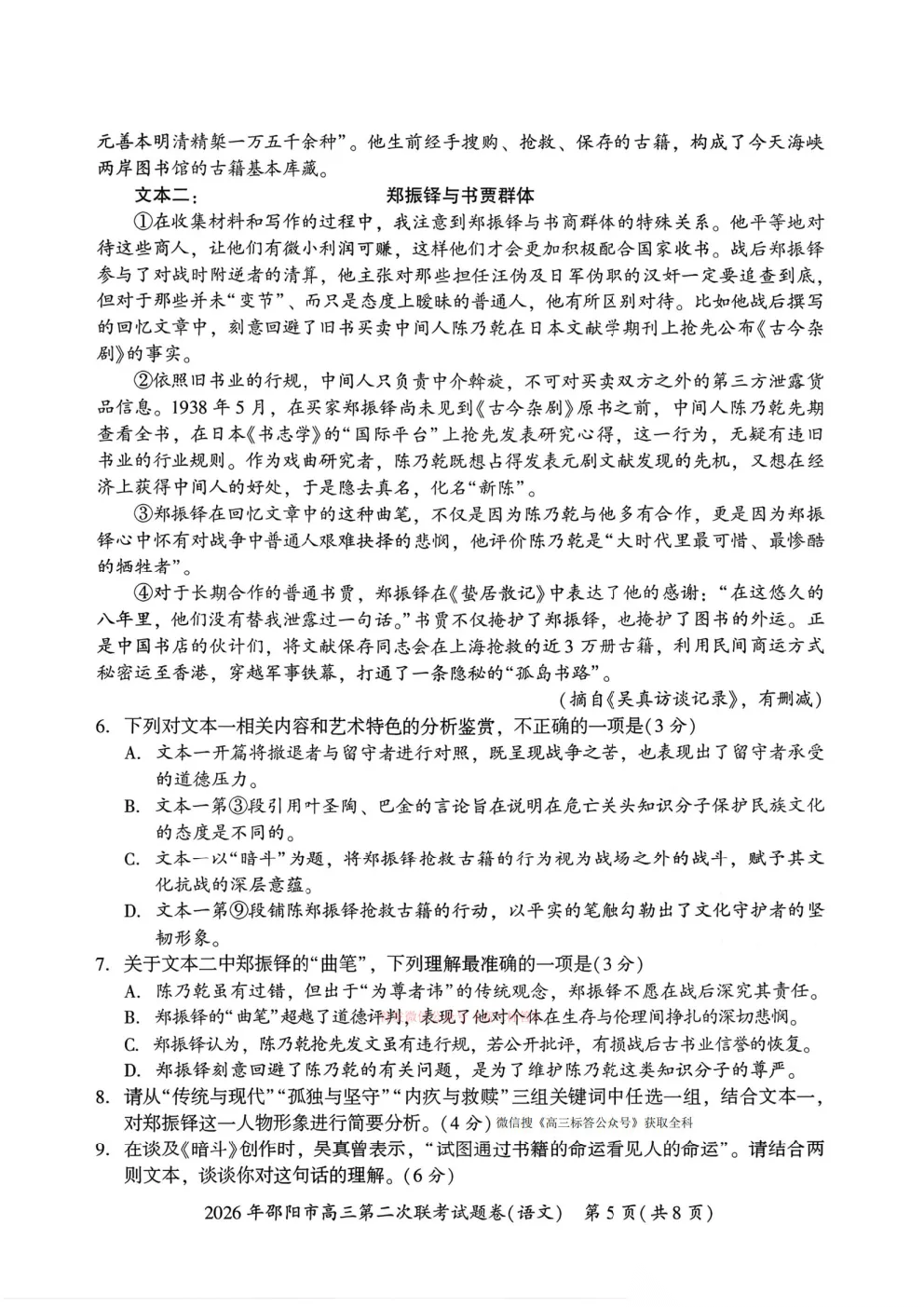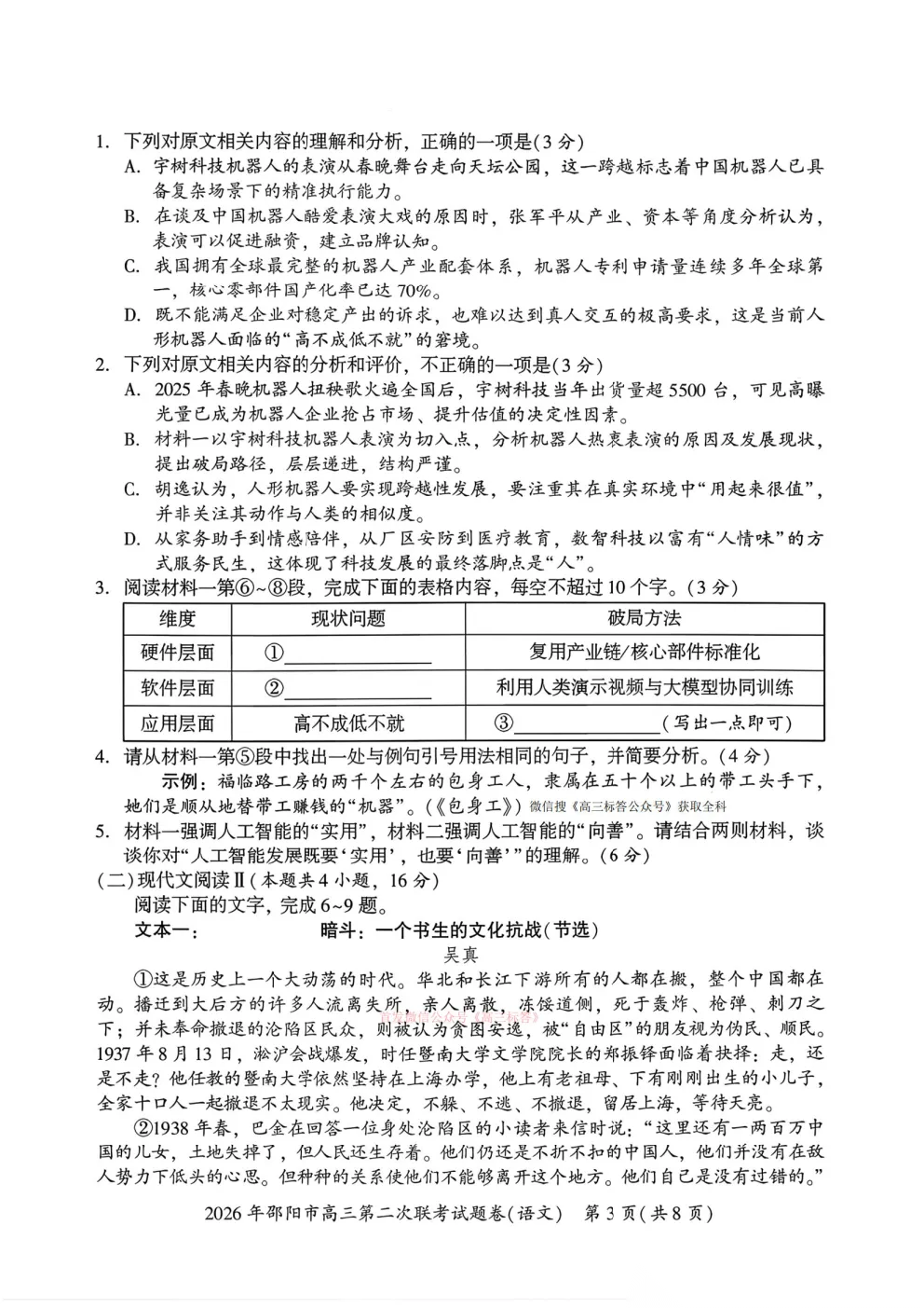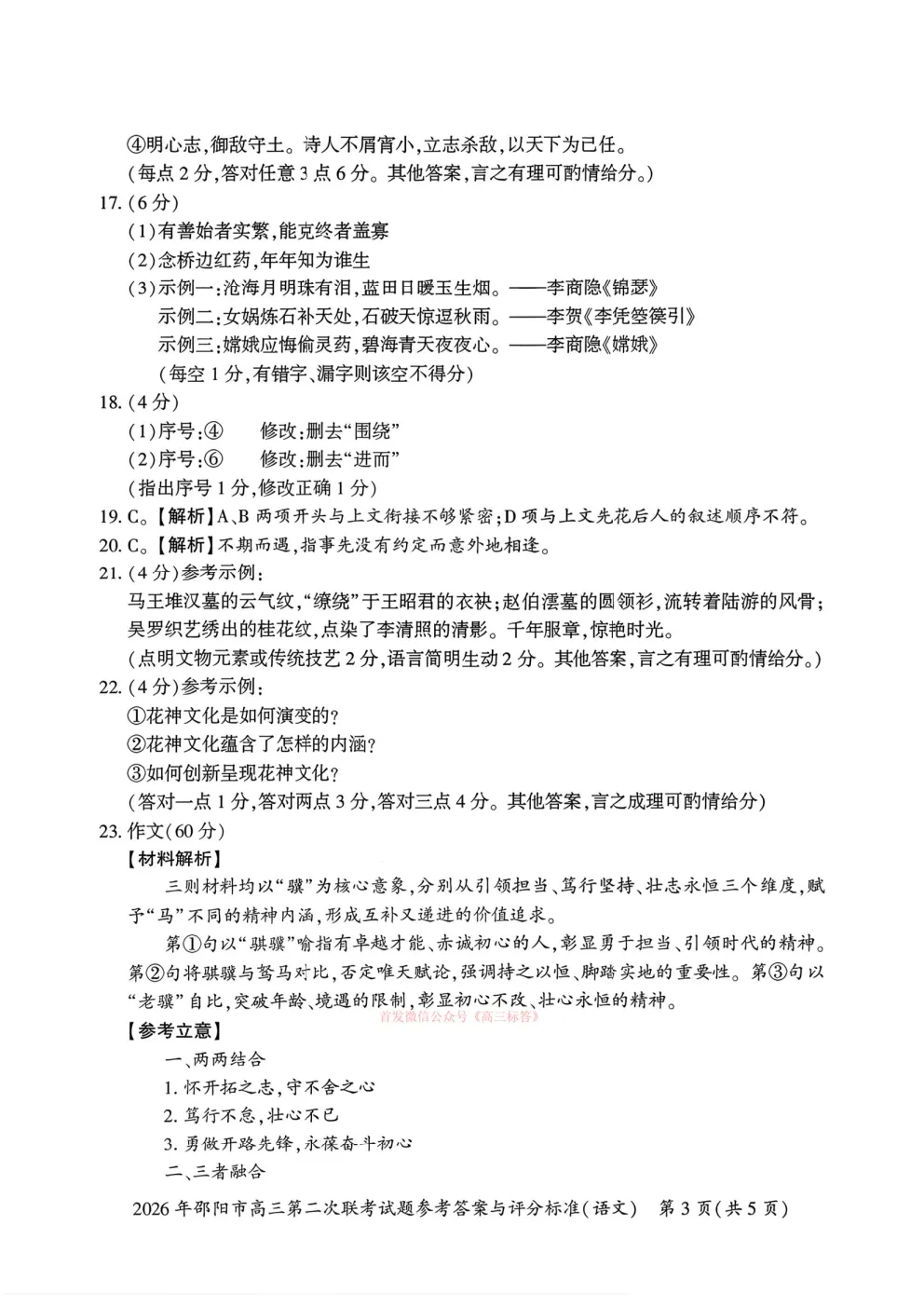 2026湖南高三3月联考答案 2026湖南高三3月联考答案