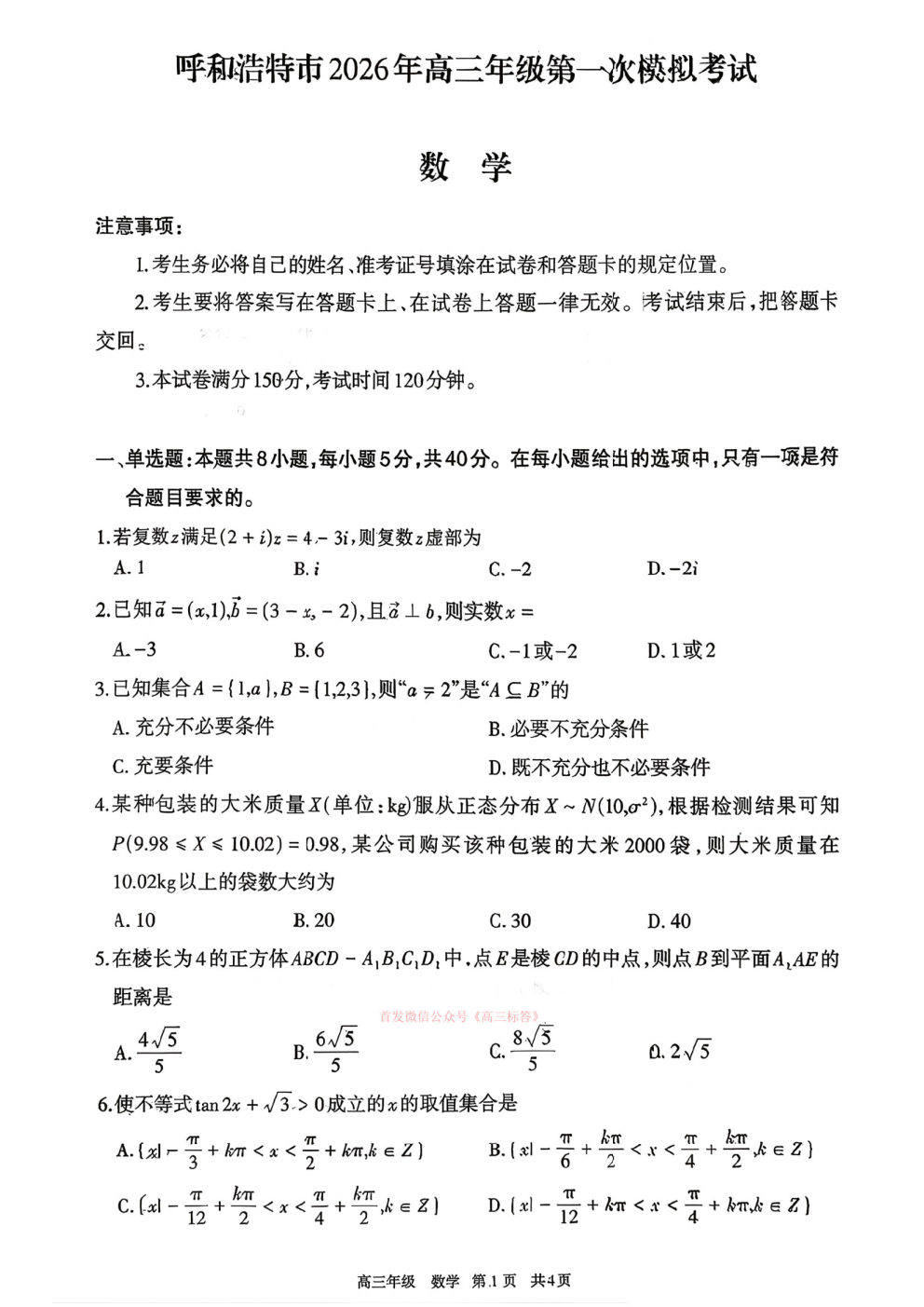 【呼和浩特一模】2026年高三年级第一次模拟考试