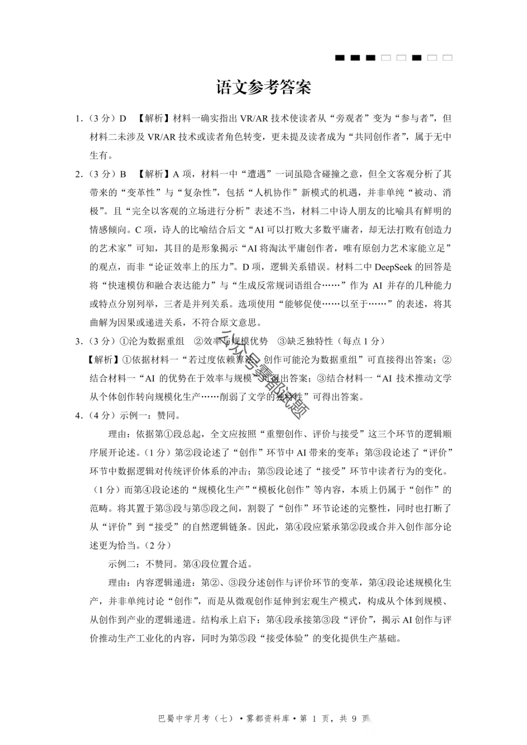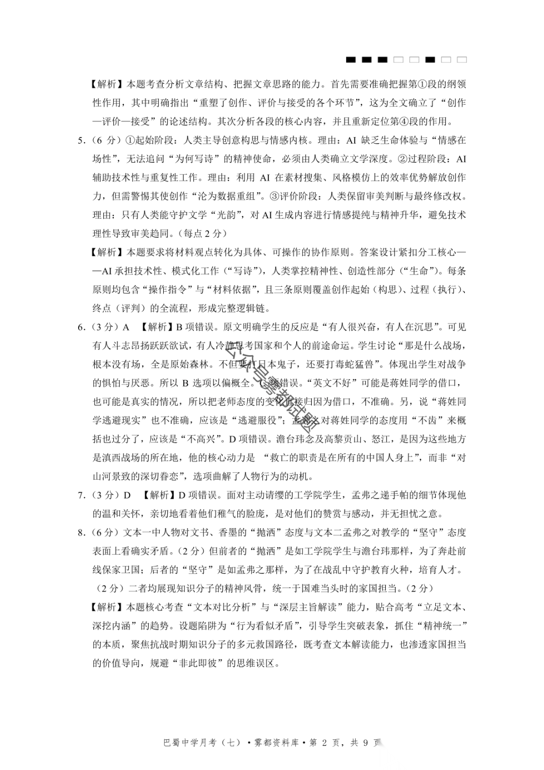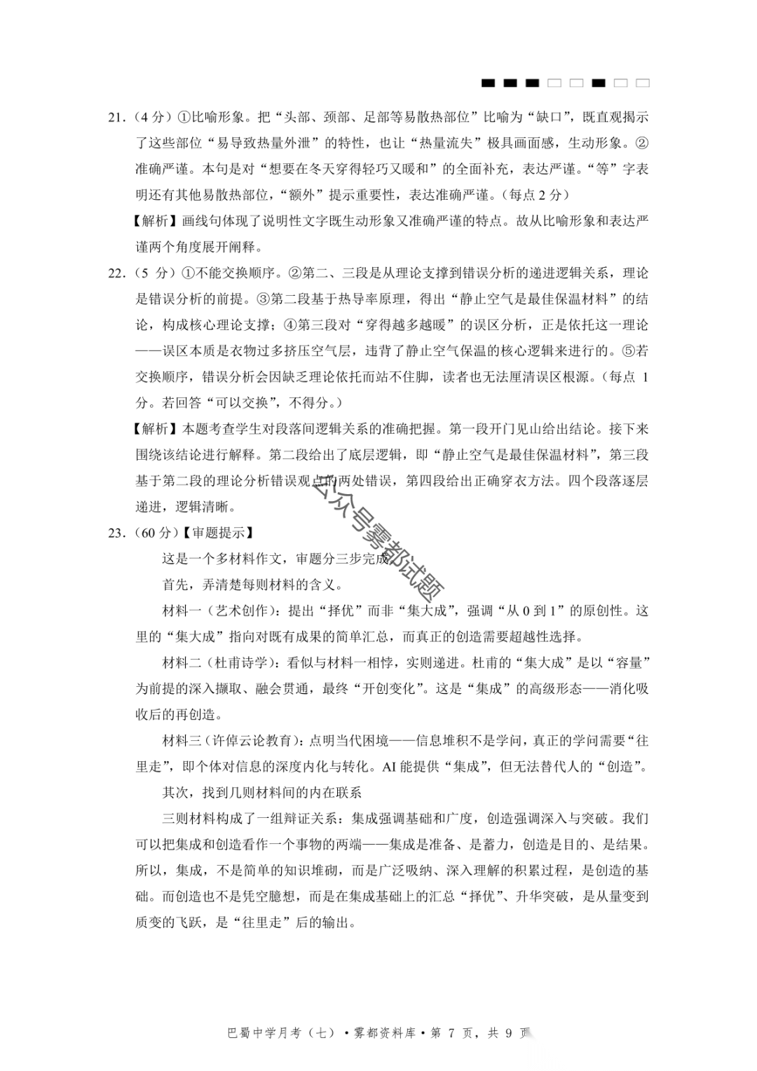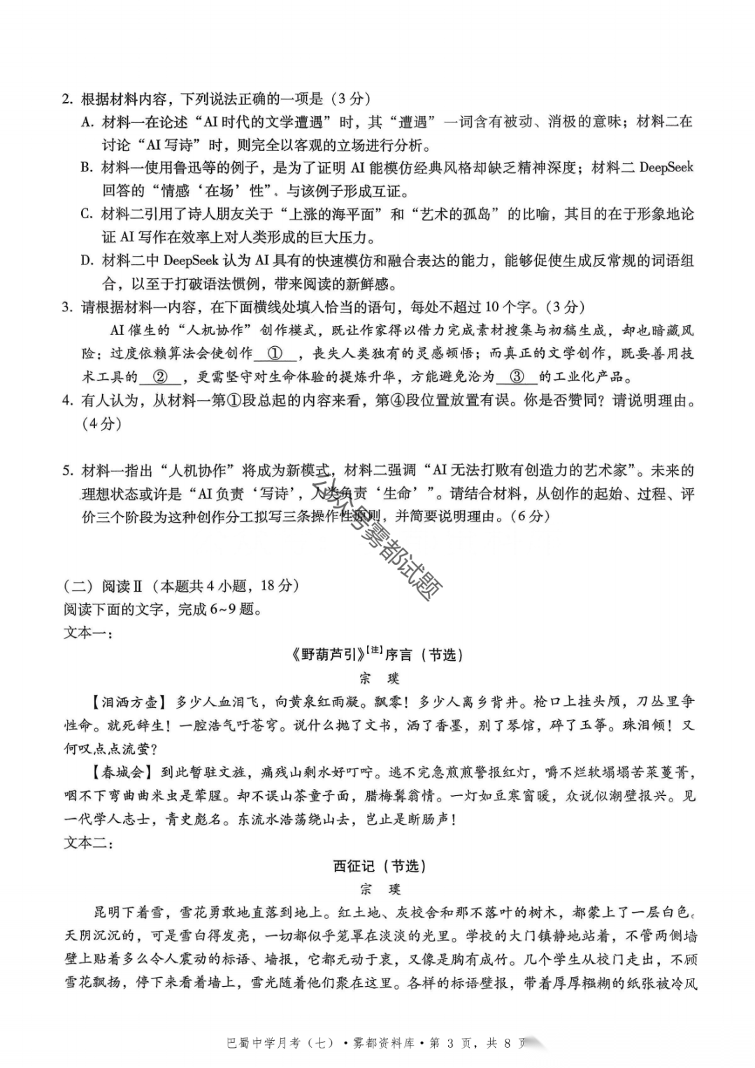 重庆市巴蜀中学2026届高三3月月考卷(七)语文、数学汇总