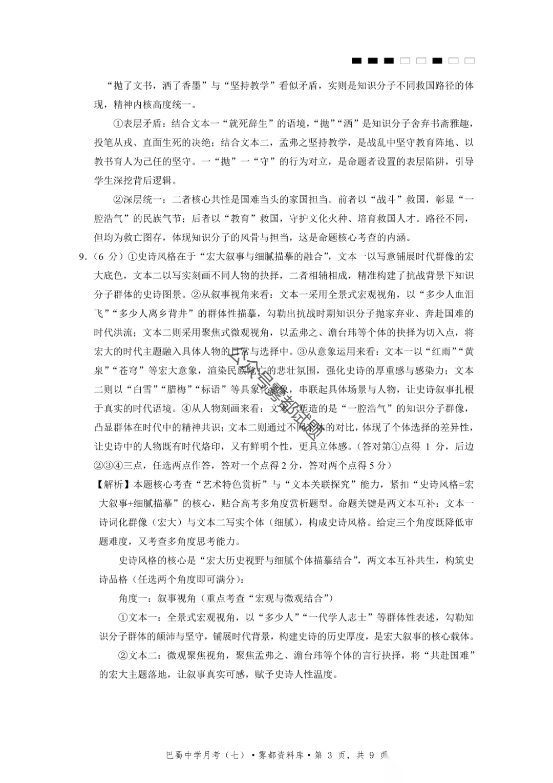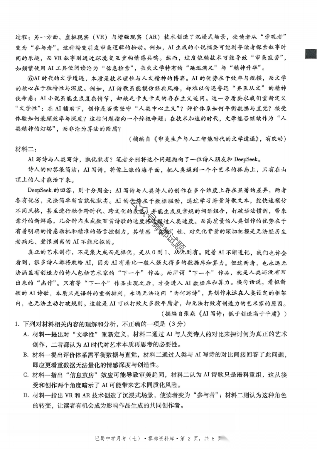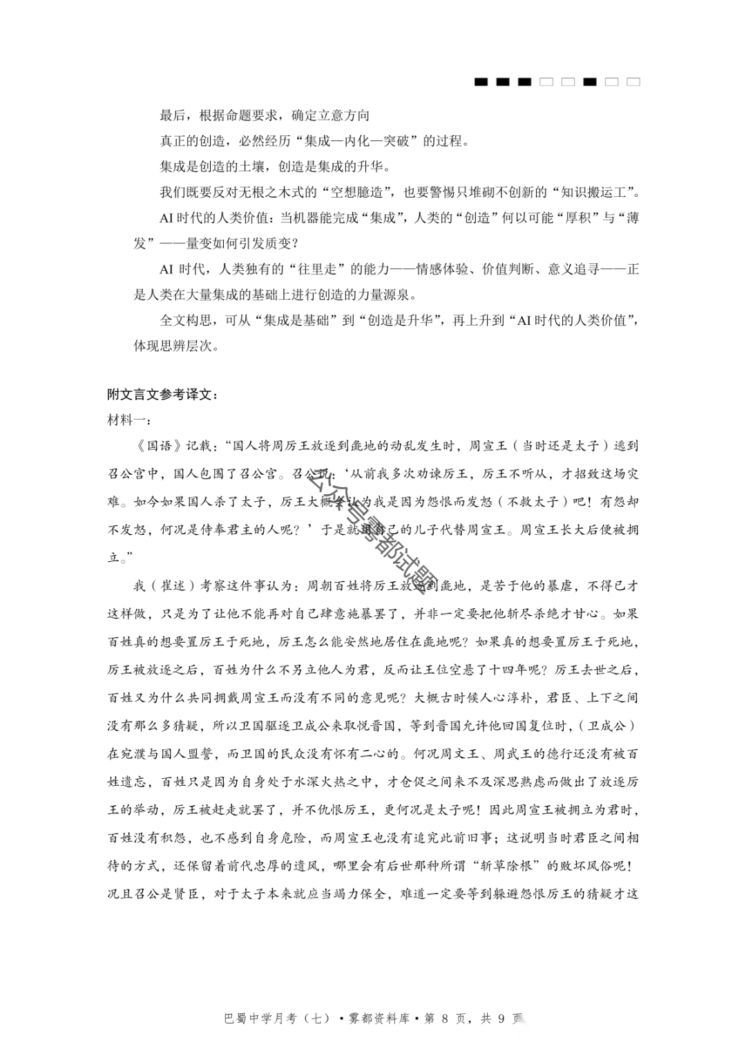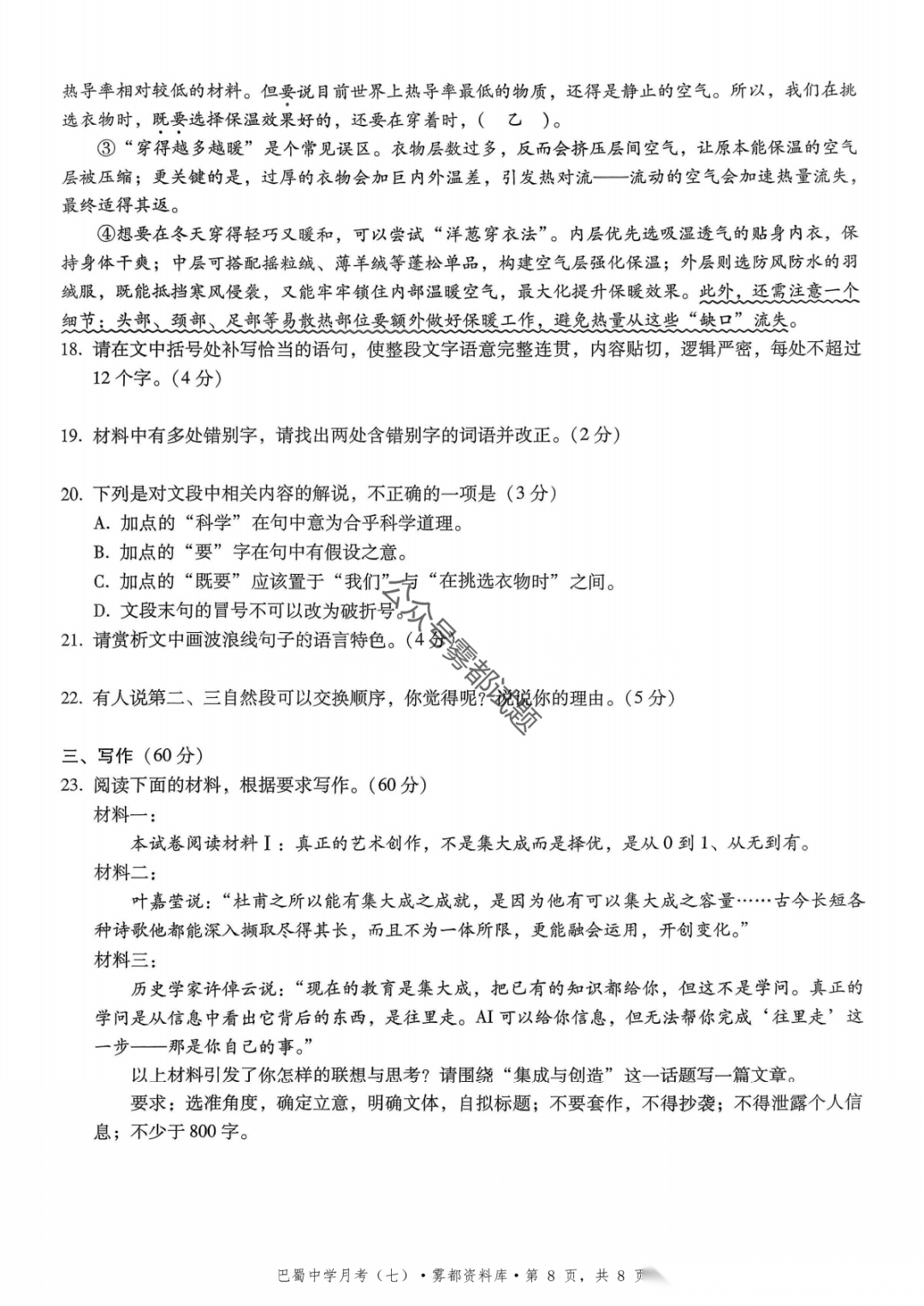 重庆市巴蜀中学2026届高三3月月考卷(七)语文、数学汇总