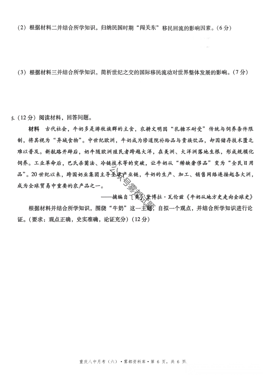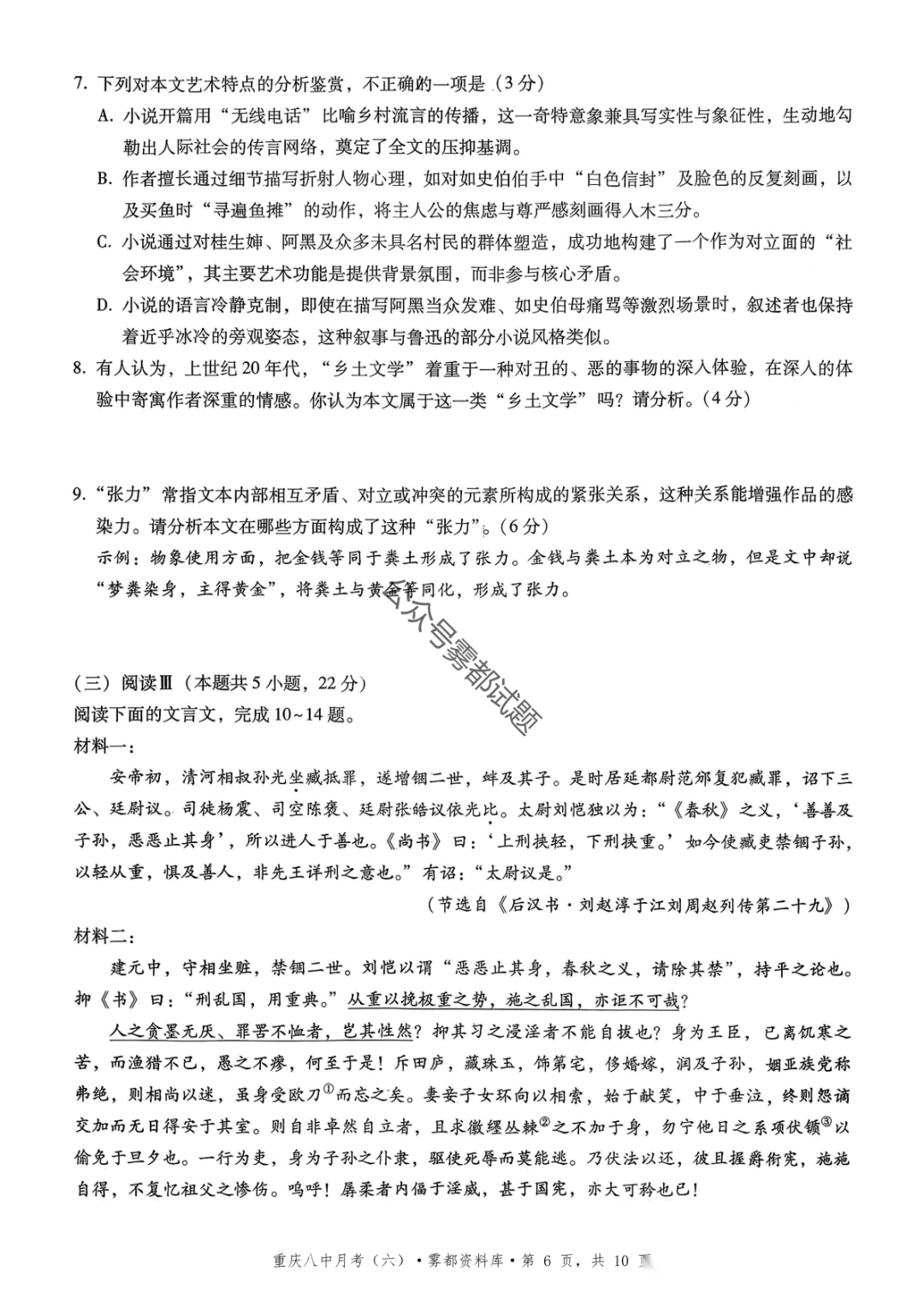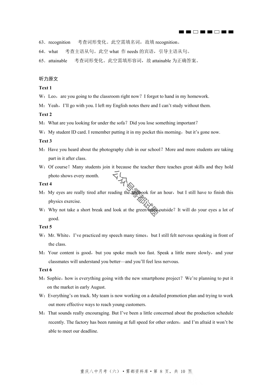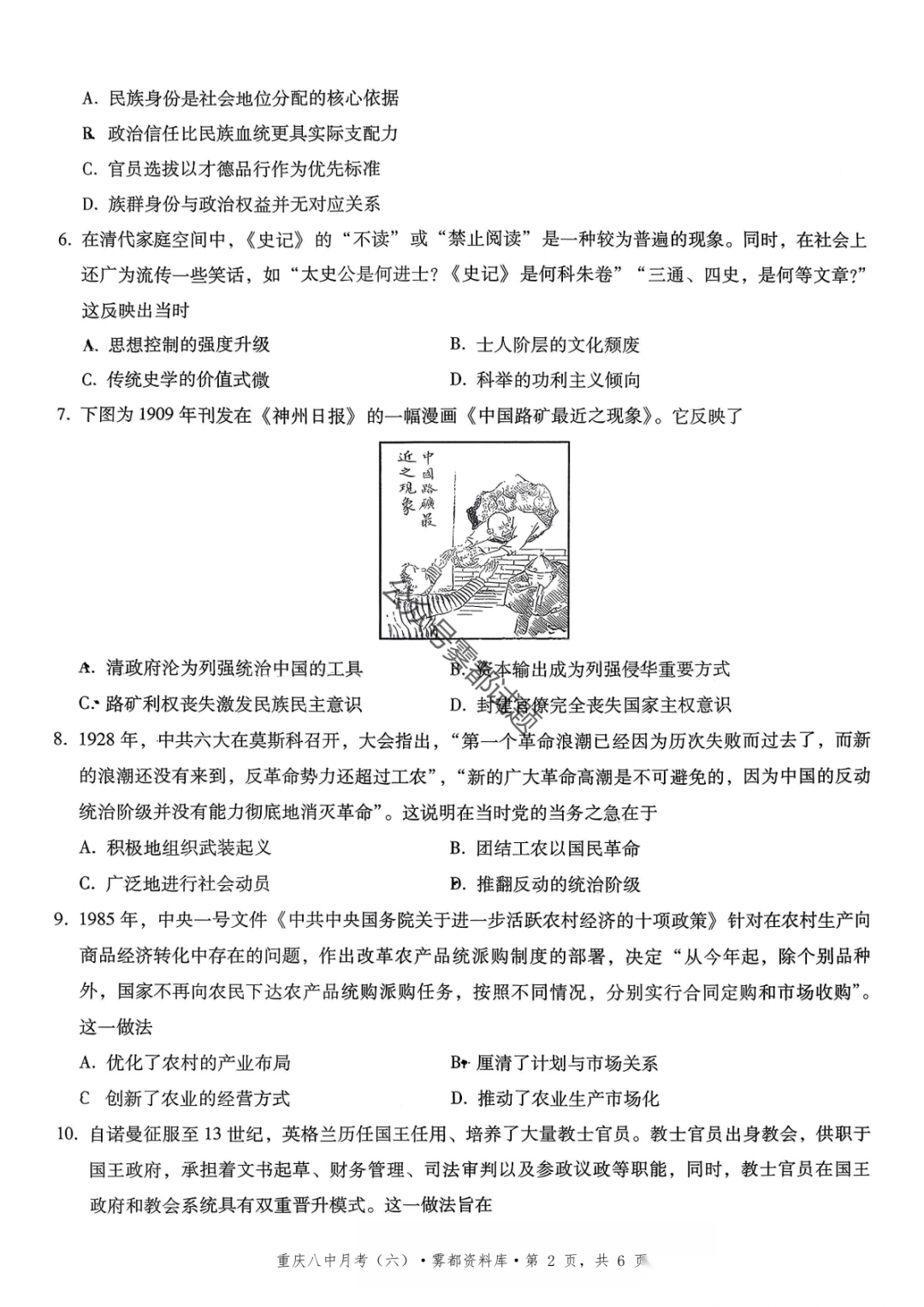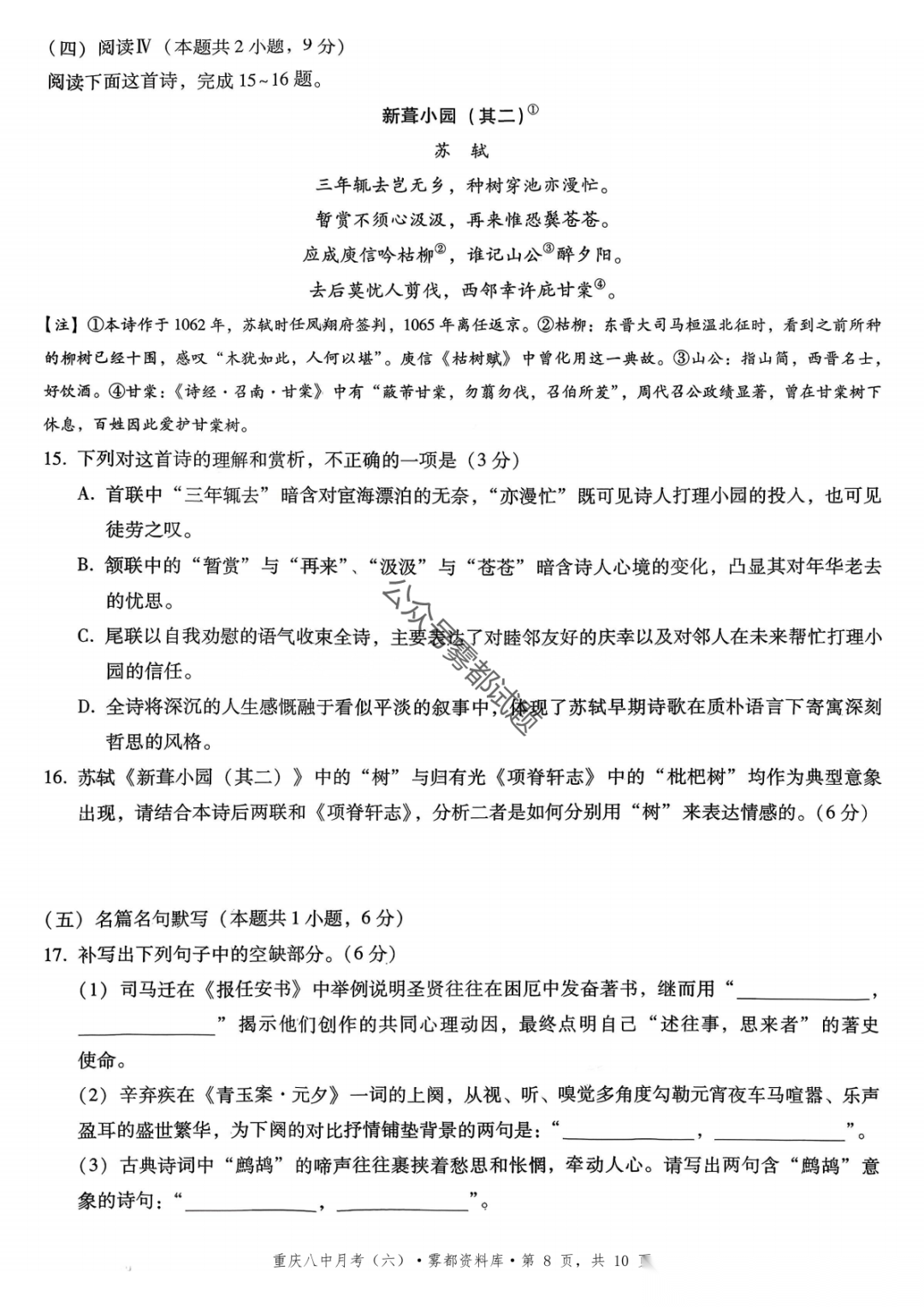 重庆市第八中学2026届高三3月月考卷(六)语文数学物理历史英语汇总