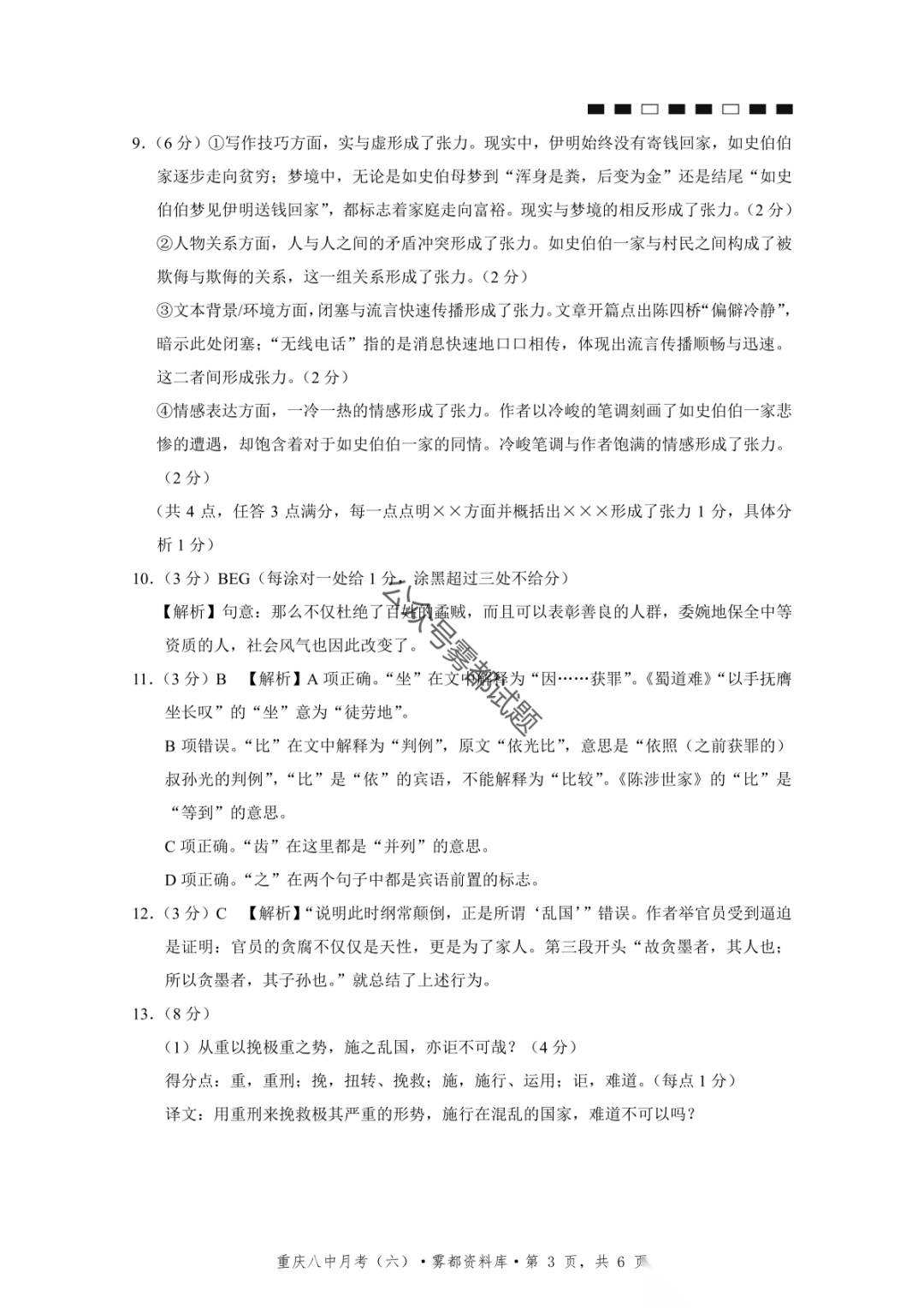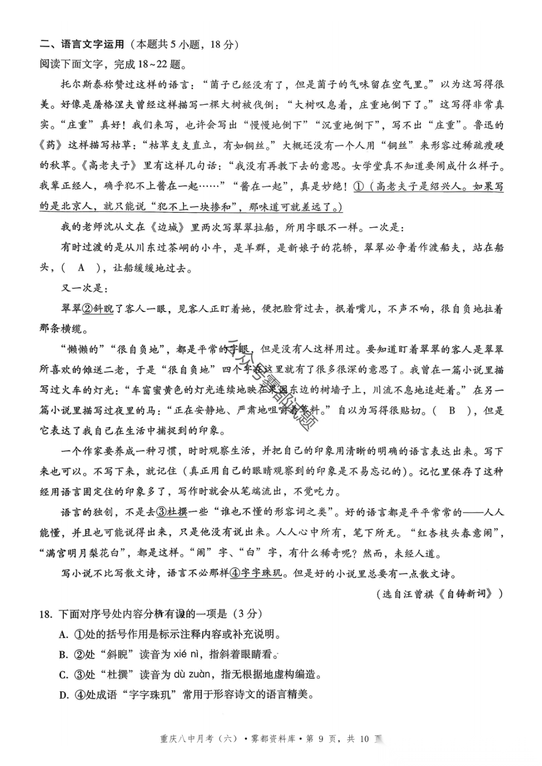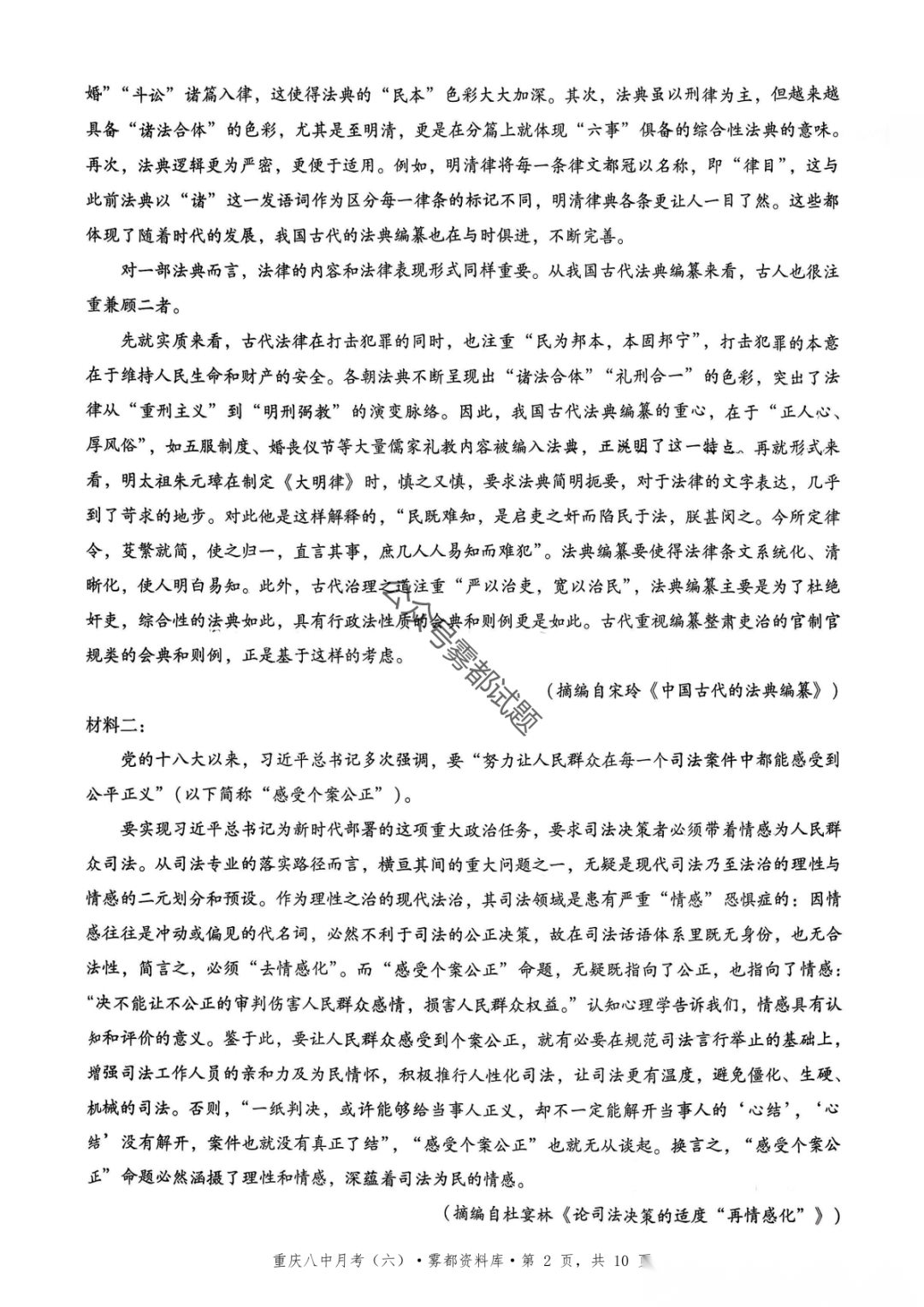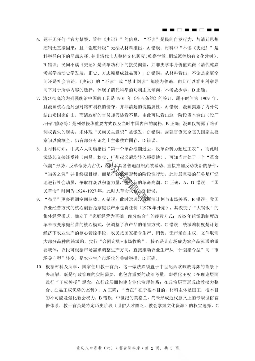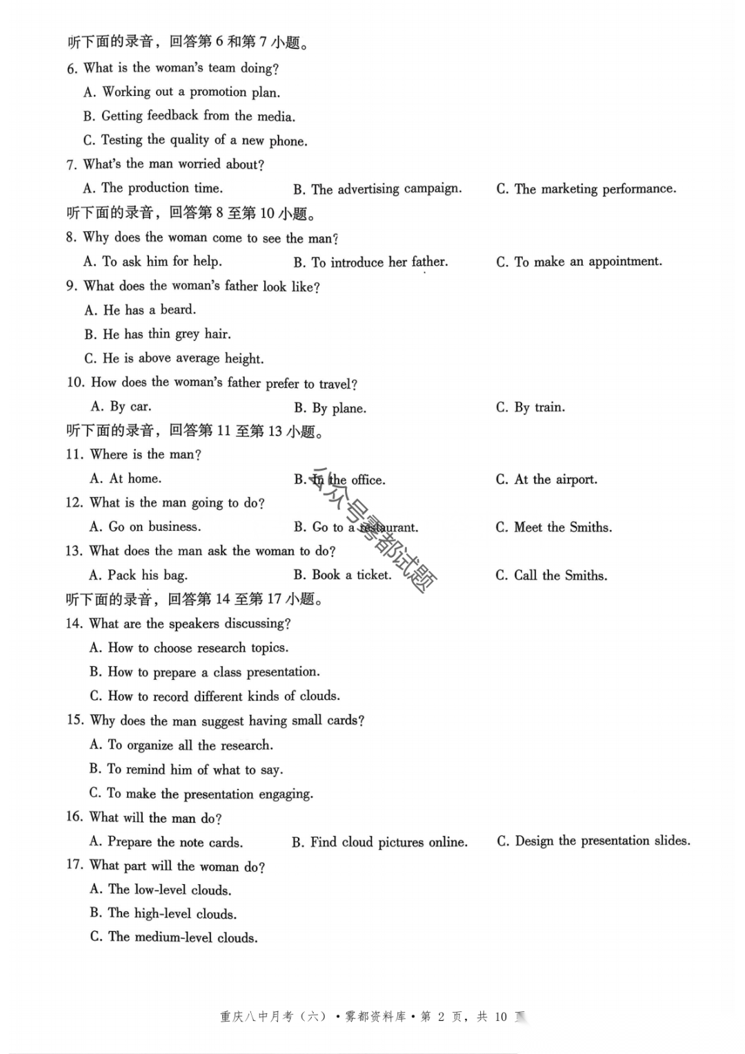 重庆市第八中学2026届高三3月月考卷(六)语文数学物理历史英语汇总