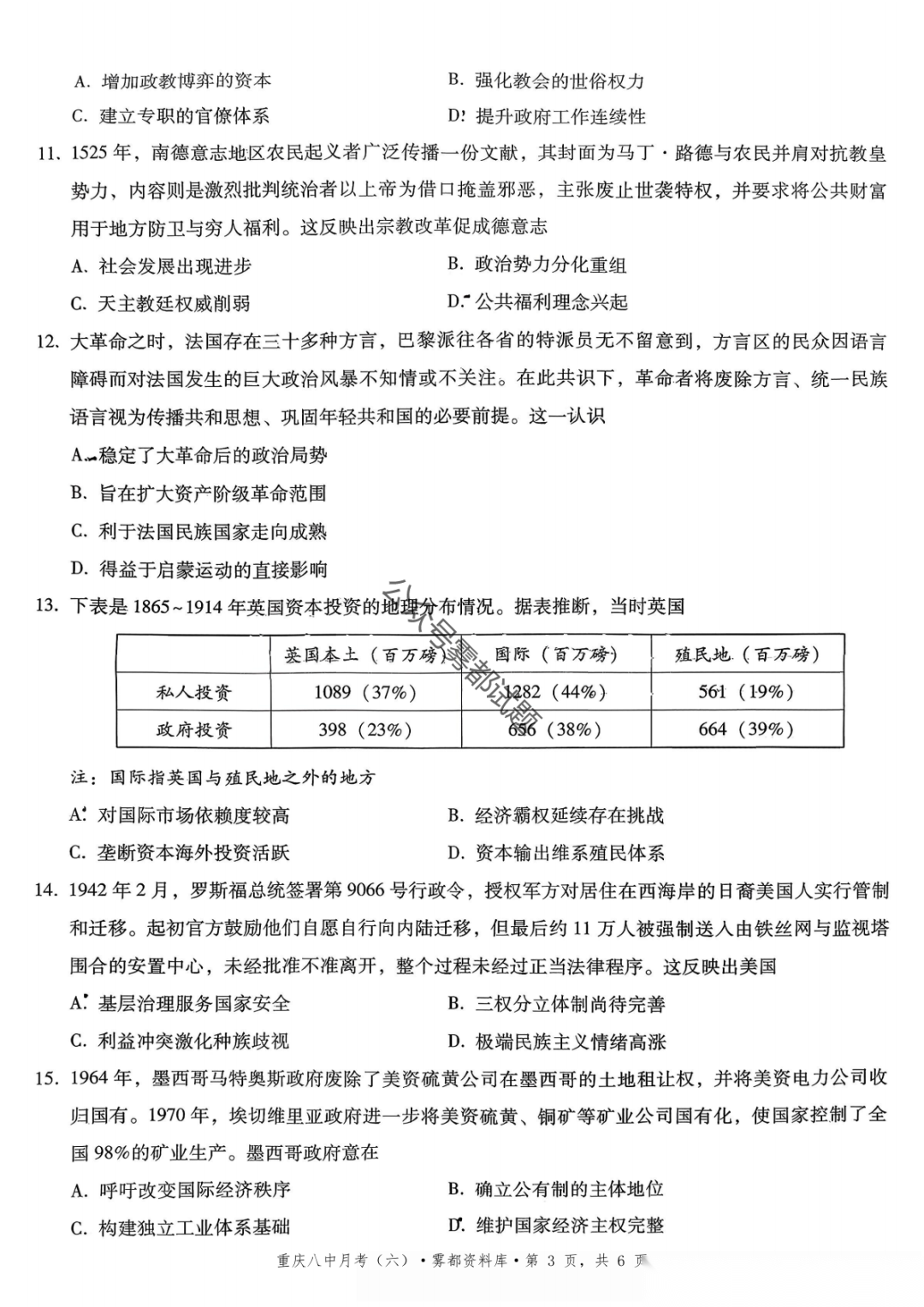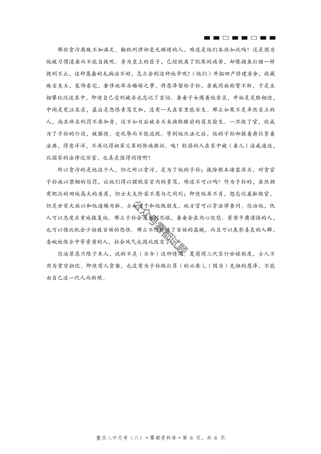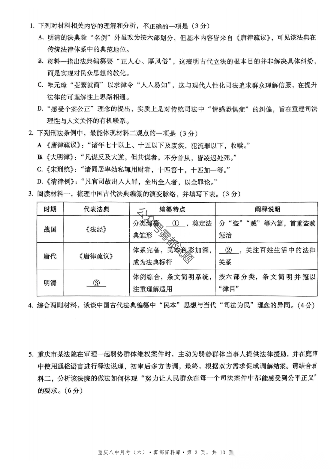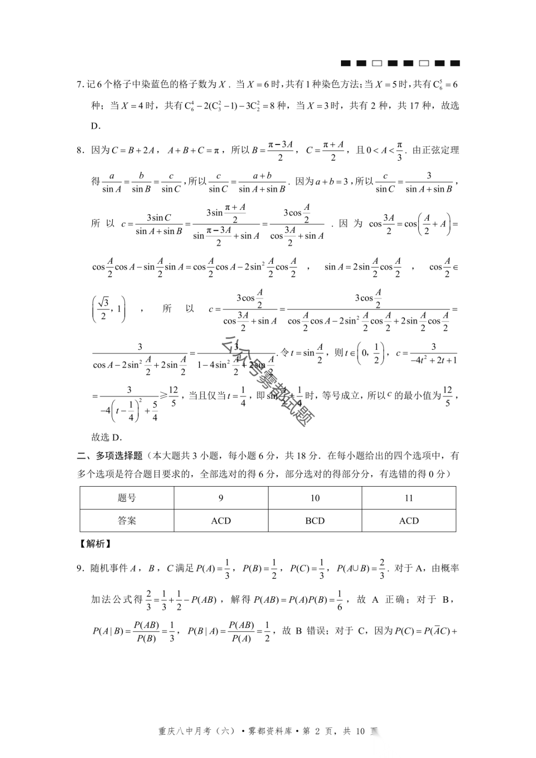 重庆市第八中学2026届高三3月月考卷(六)语文数学物理历史英语汇总