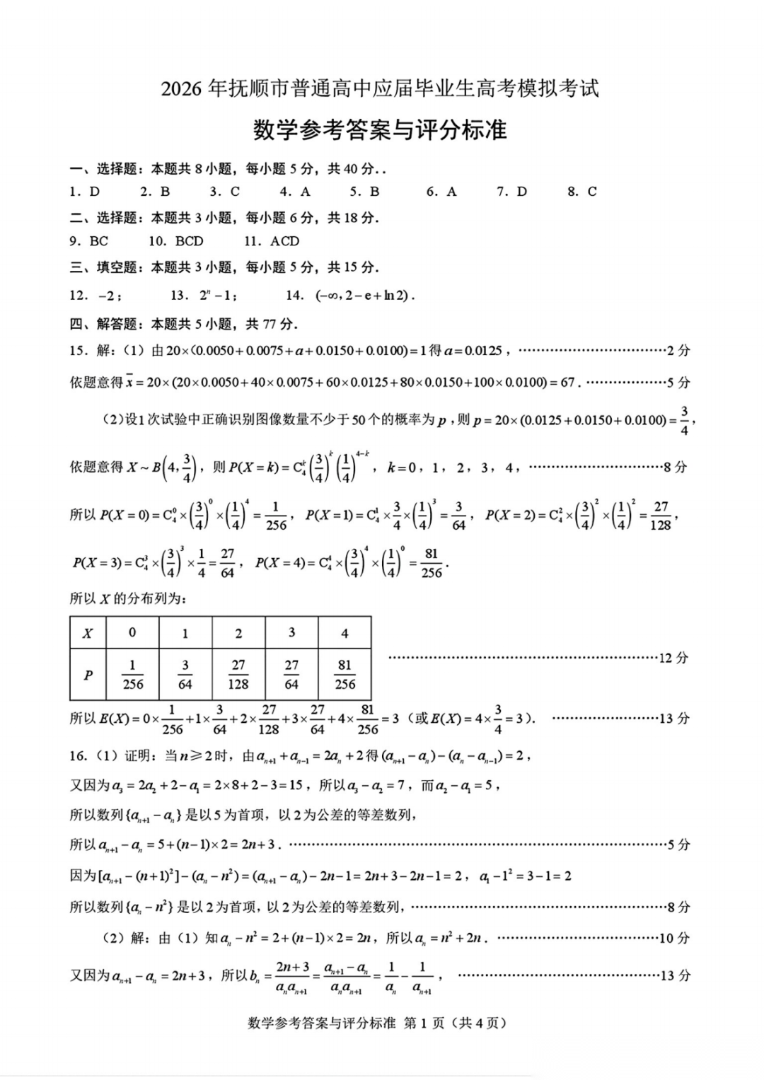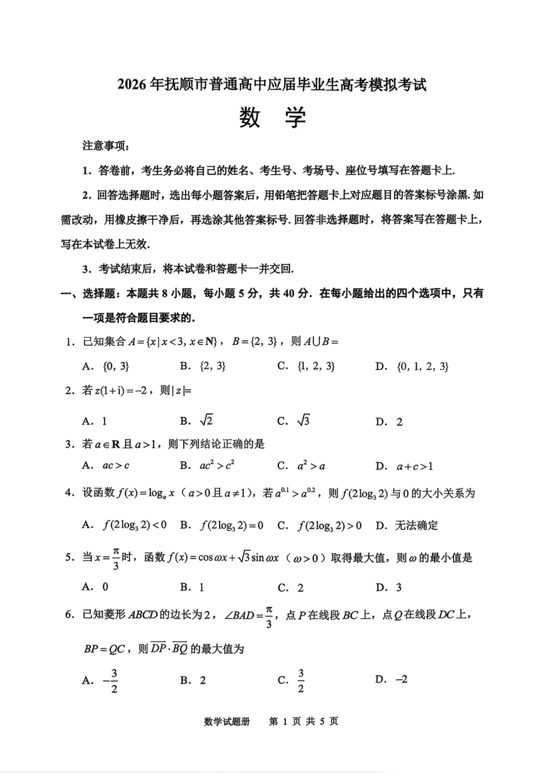 【抚顺一模全科】2026年抚顺市普通高中应届毕业生高考模拟考试