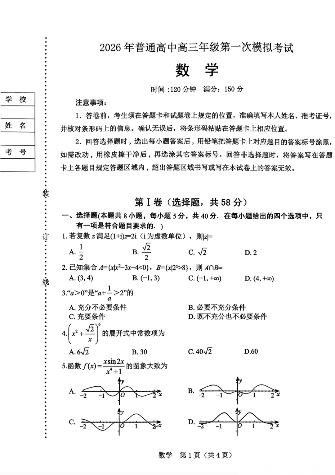 【抚顺一模全科】2026年抚顺市普通高中应届毕业生高考模拟考试 【抚顺一模全科】2026年抚顺市普通高中应届毕业生高考模拟考试