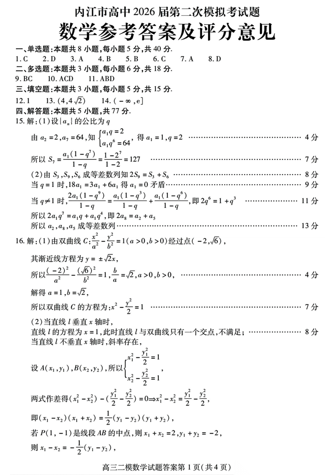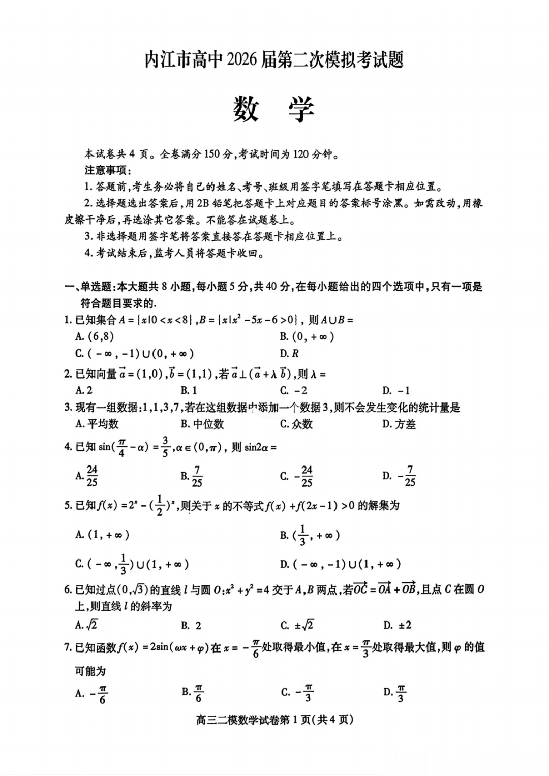 【内江二模全科】内江市高中2026届高三第二次模拟考试