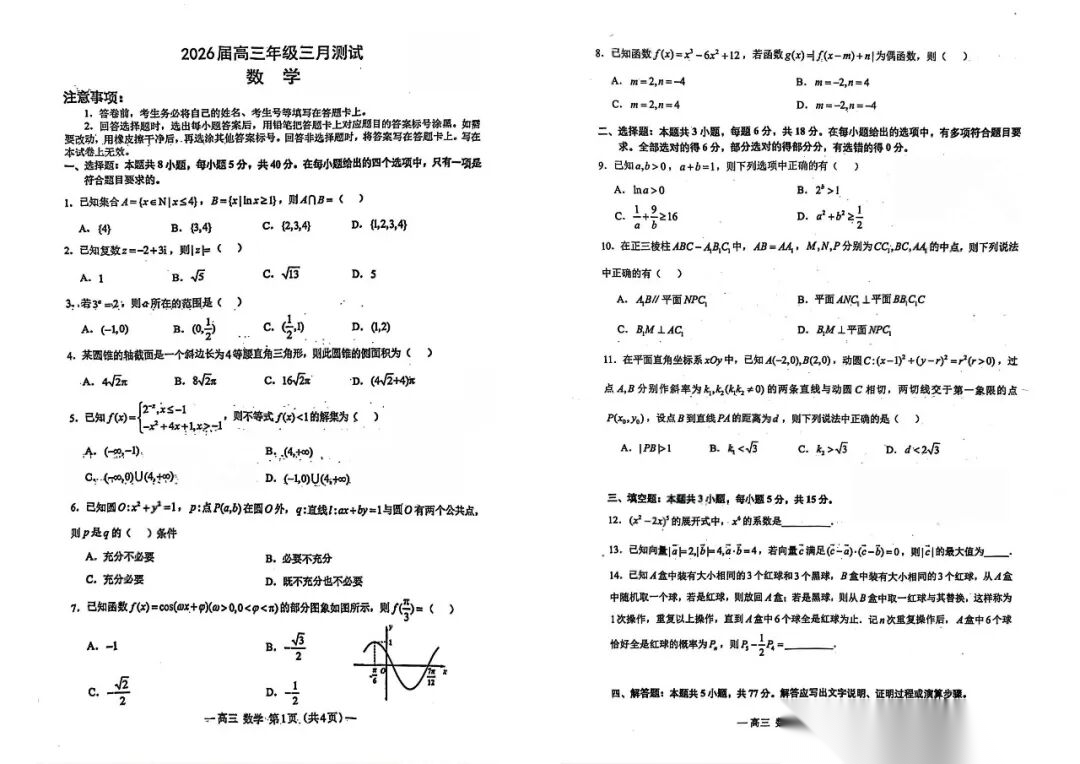 2026届湖北省楚天协作体高三3月联考试卷及答案解析 2026届湖北省楚天协作体高三3月联考试卷及答案解析