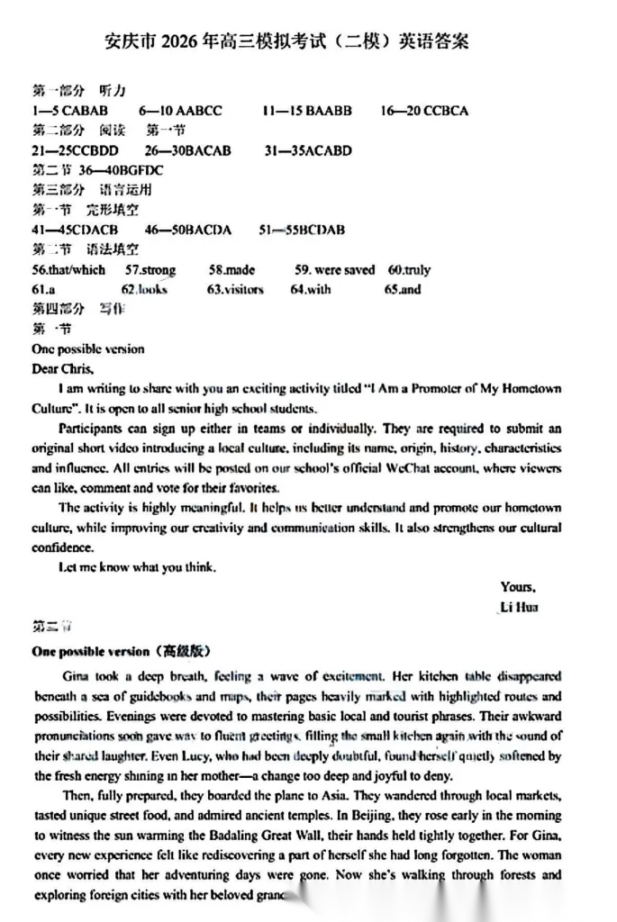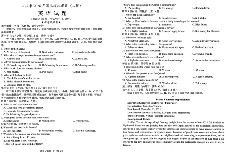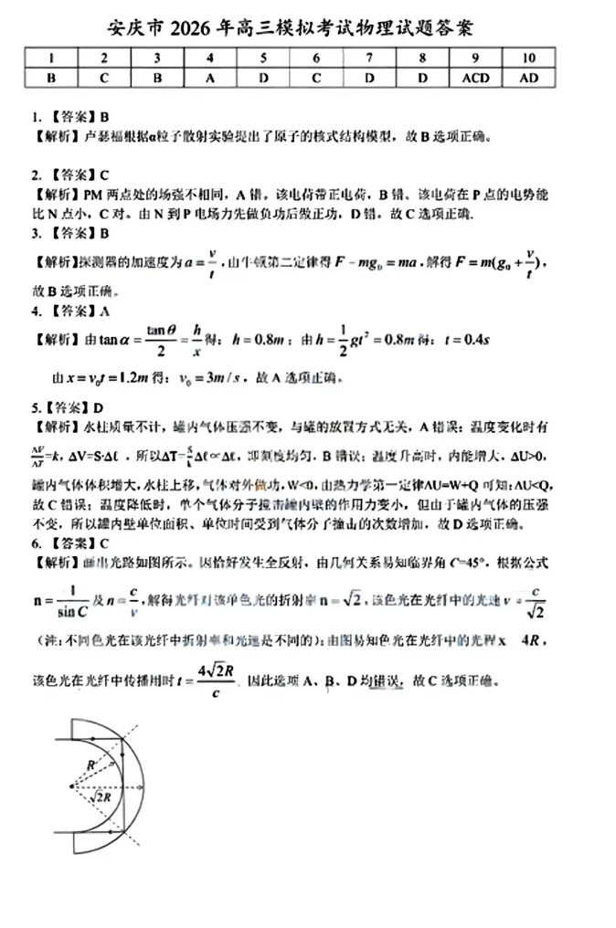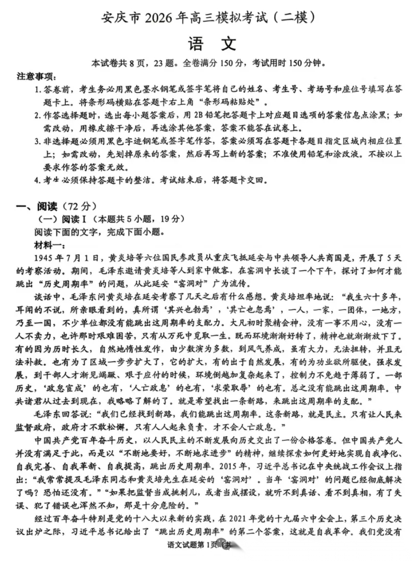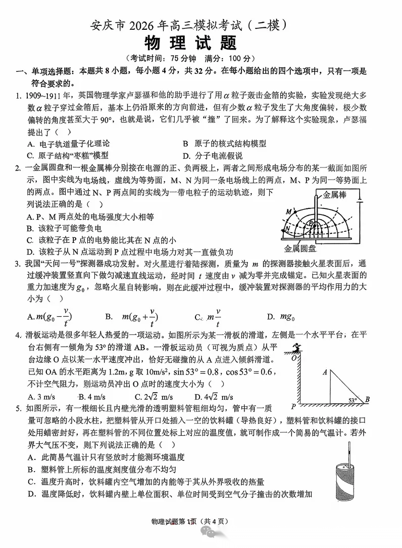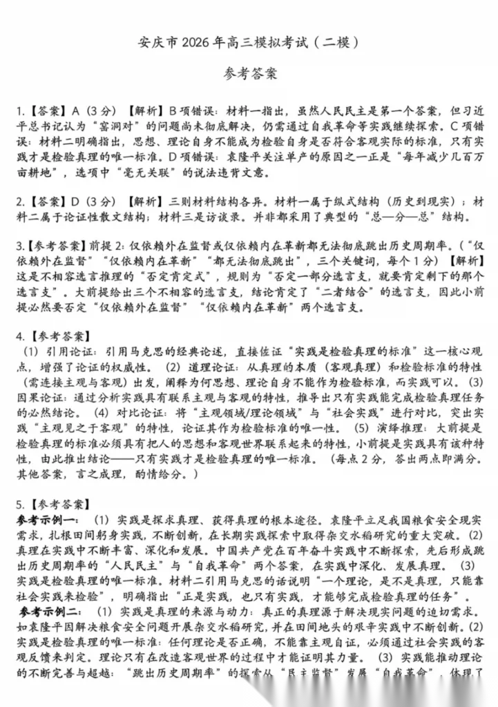 【安徽卷】安徽省安庆市2026年高三年级模拟考试(安庆二模)(3.18-3.20) 全科试题卷+答案