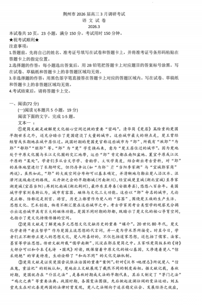 【湖北卷】湖北省荆州市2026届高三3月调研考试(荆州一模)(3.18-3.19) 全科试题卷(无地政)+答案