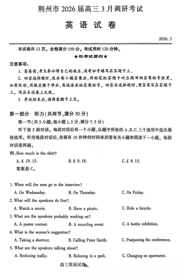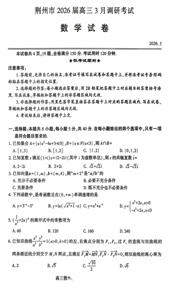 高三,【汇总】湖北省荆州市2026届高三3月调研考试 高三,【汇总】湖北省荆州市2026届高三3月调研考试