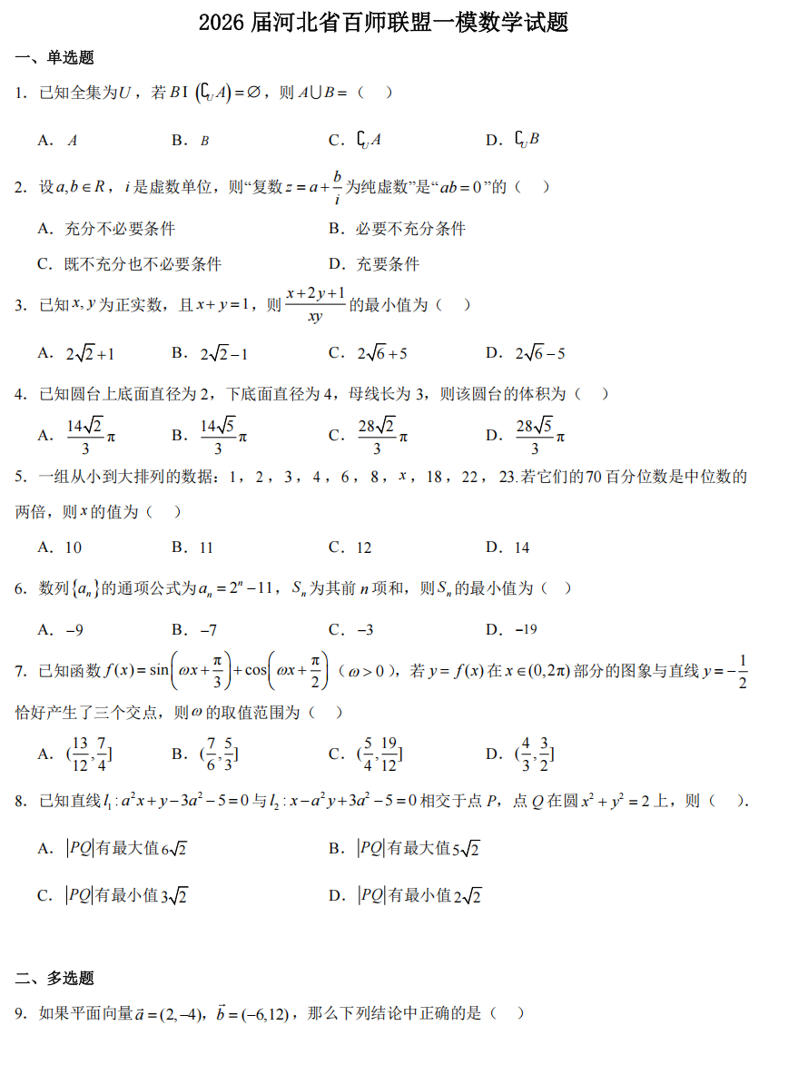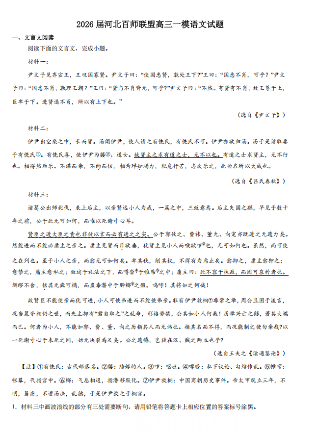 【河北卷】河北省百师联盟2026届高三下学期3月第一次质量检测(河北百师一模)(3.11-3.12) 全科试题卷(含日语)+答案