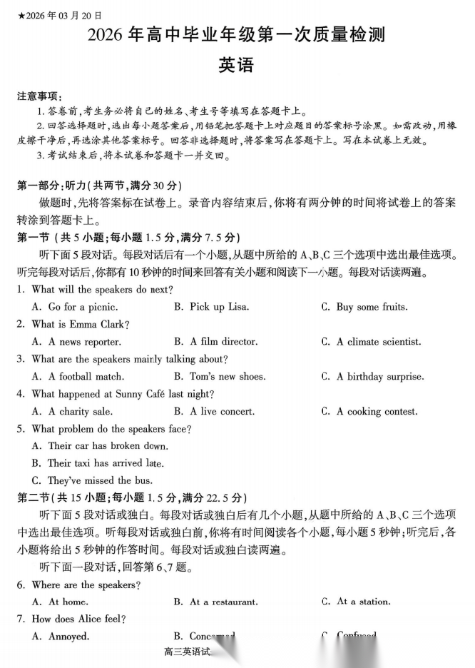 【河南卷】河南省驻马店、信阳、南阳、三门峡、漯河五市2026年高三3月第一次质量检测联考(3.19-3.20) 全科试题卷+答案