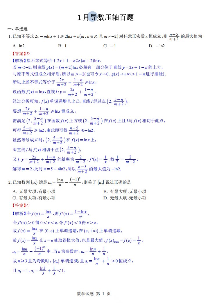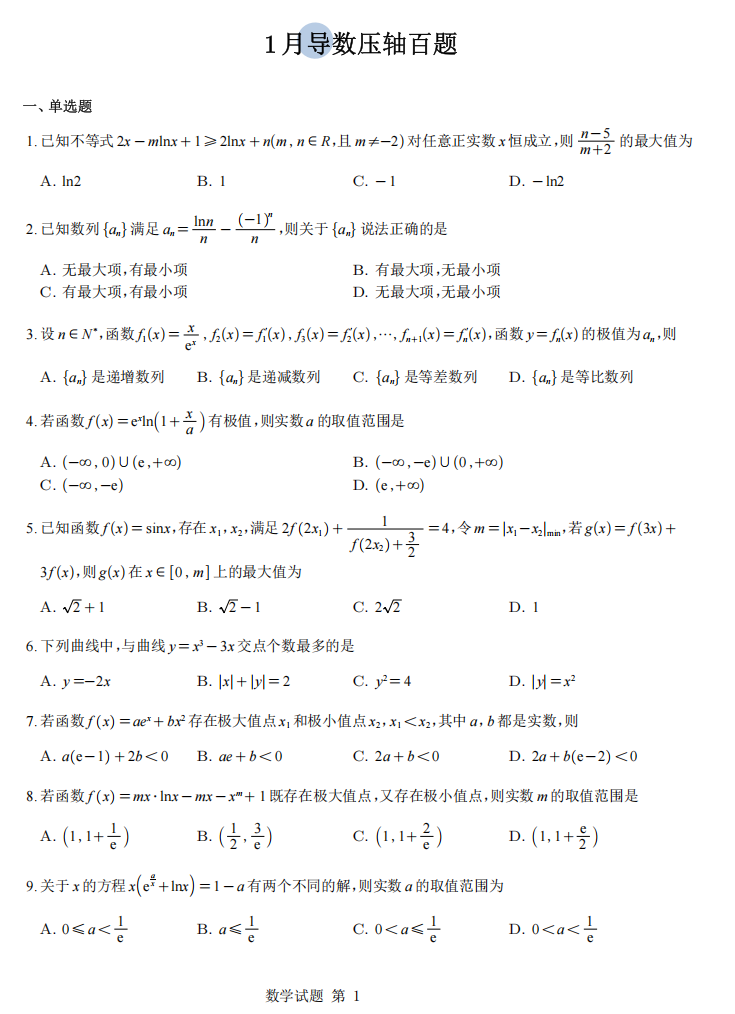 【高考数学】【模考难题合集】2026年1月模考联考真题导数压轴百题汇编 学生版+解析版(完整版)