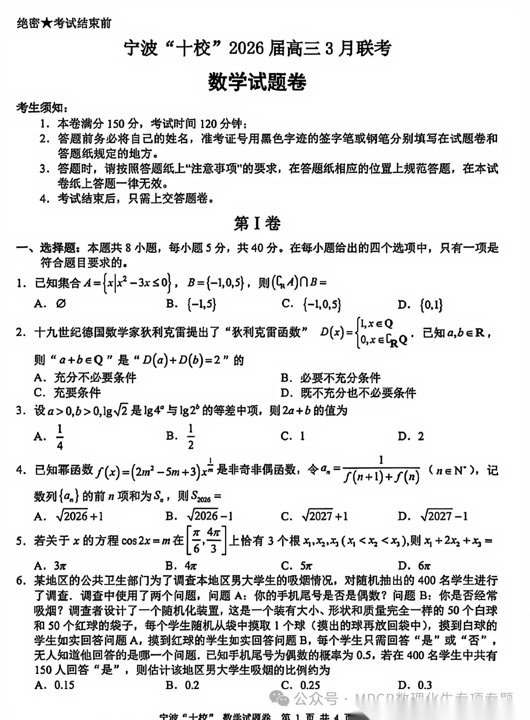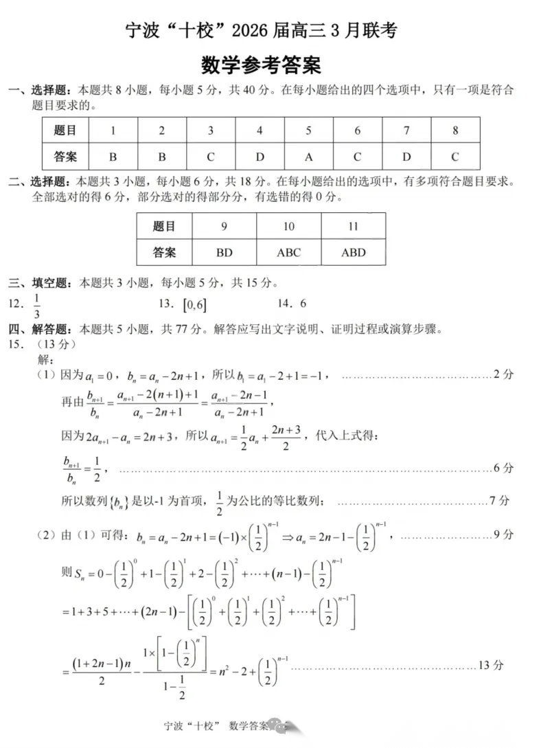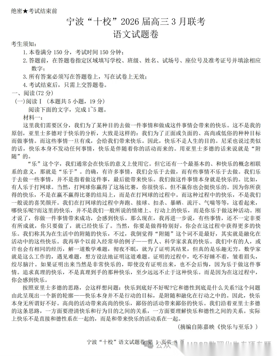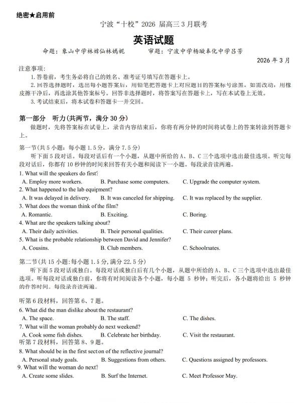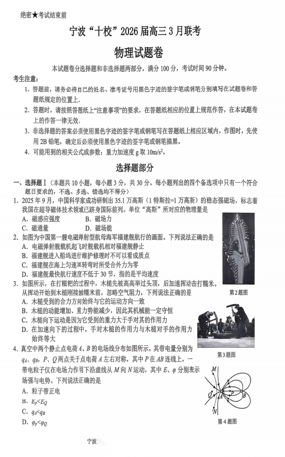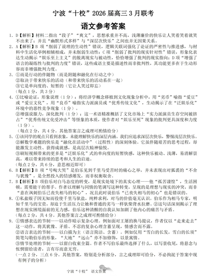 【浙江卷】浙江省宁波十校2026届高三年级3月联考(3.18-3.20) 数学物理英语语文地理政治试题卷+答案