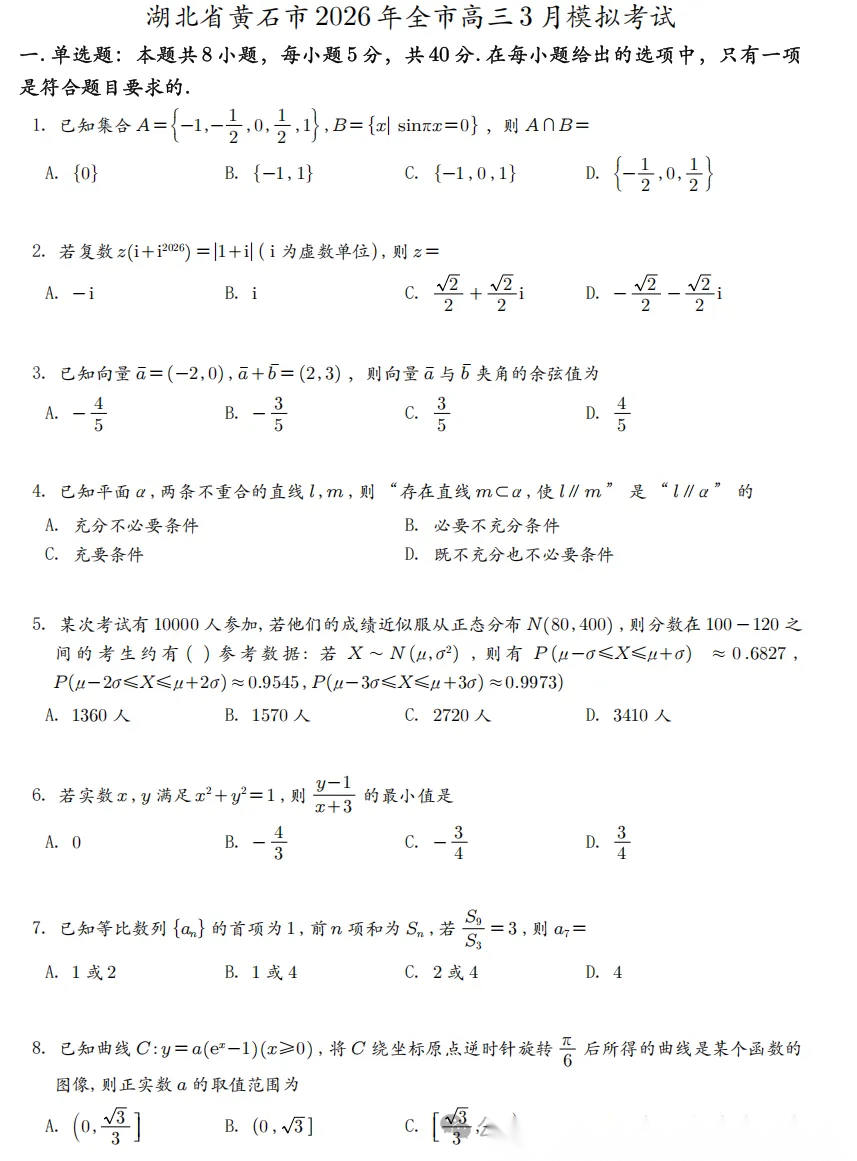 【湖北卷】湖北省八市州(黄石市等)2026年全市高三年级3月模拟考试(黄石一模)(3.17-3.19) 全科试题卷+答案