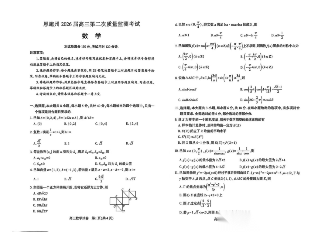 湖北省恩施州2026届高三第二次质量监测考试(恩施二模)