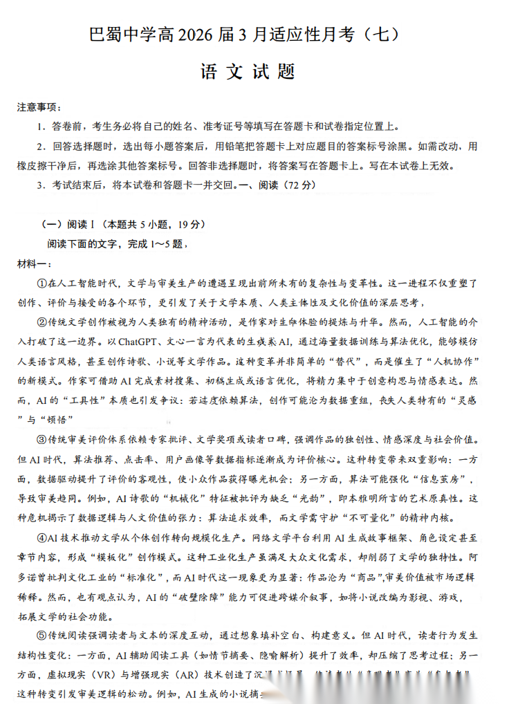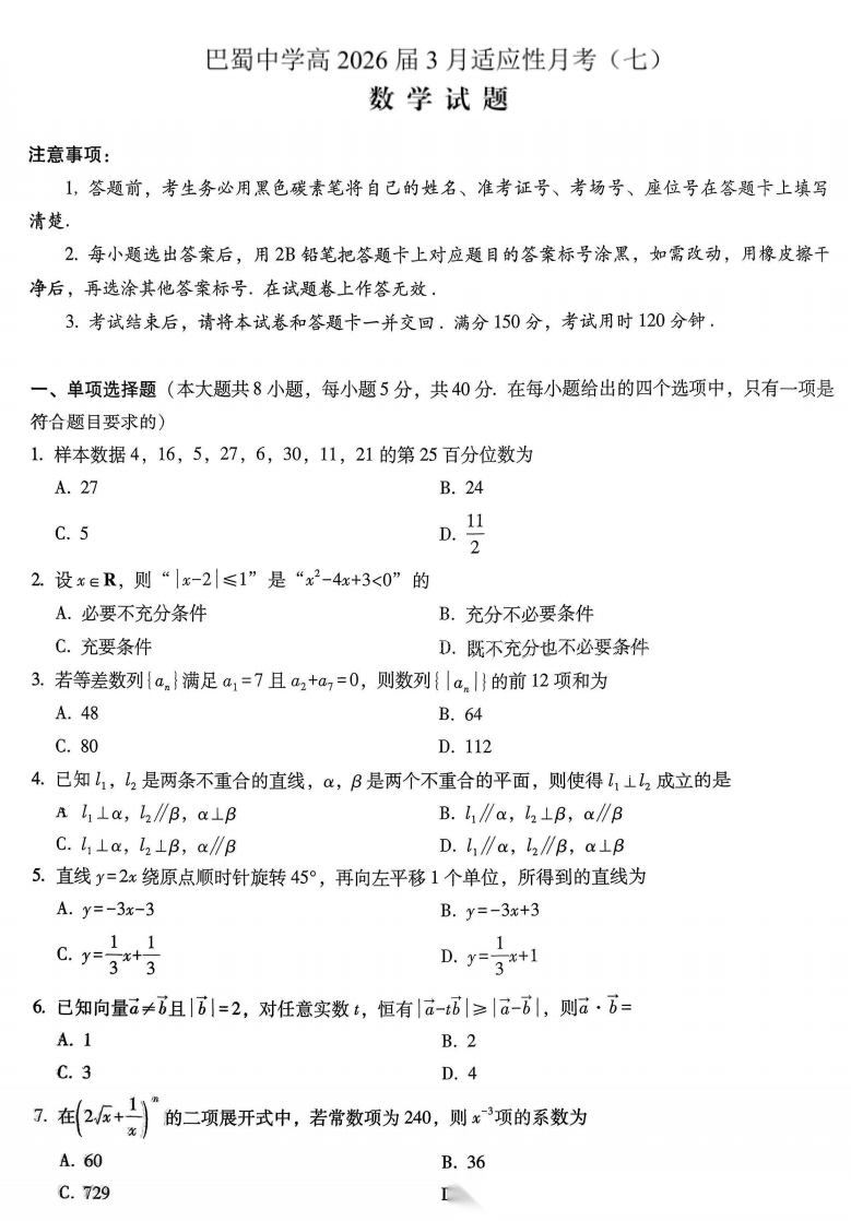 【全科】重庆市巴蜀中学2026届高三高考适应性月考卷(七) 【全科】重庆市巴蜀中学2026届高三高考适应性月考卷(七)