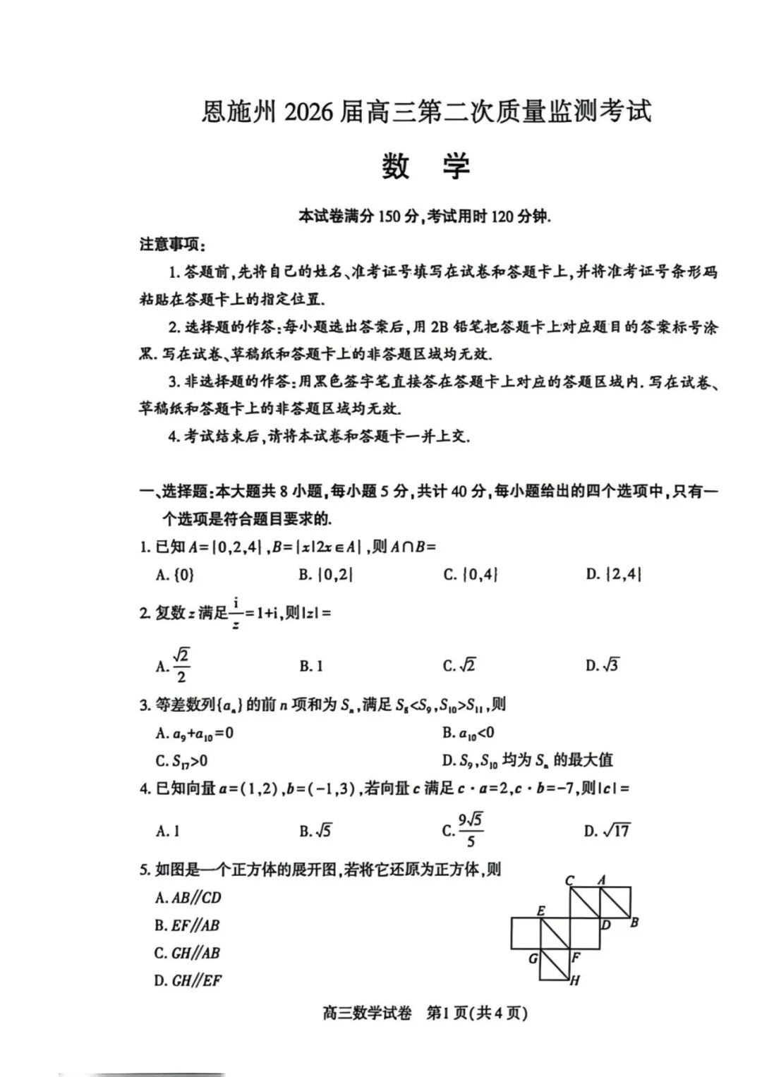 【全科】湖北省恩施州2026届高三第二次质量监测考试