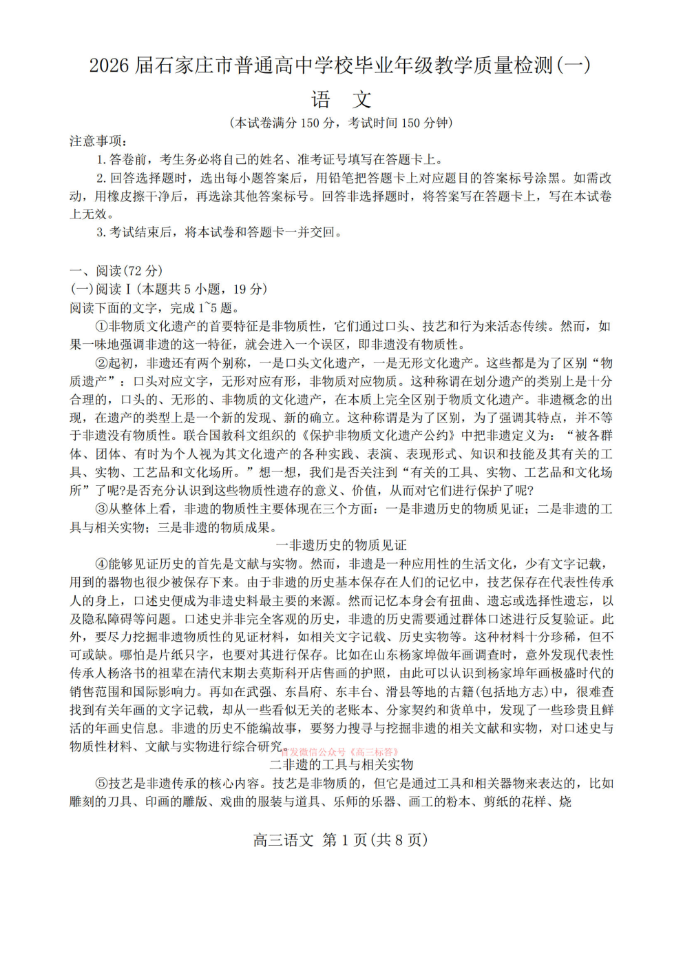 【石家庄一模】2026届石家庄市高三教学质量检测一
