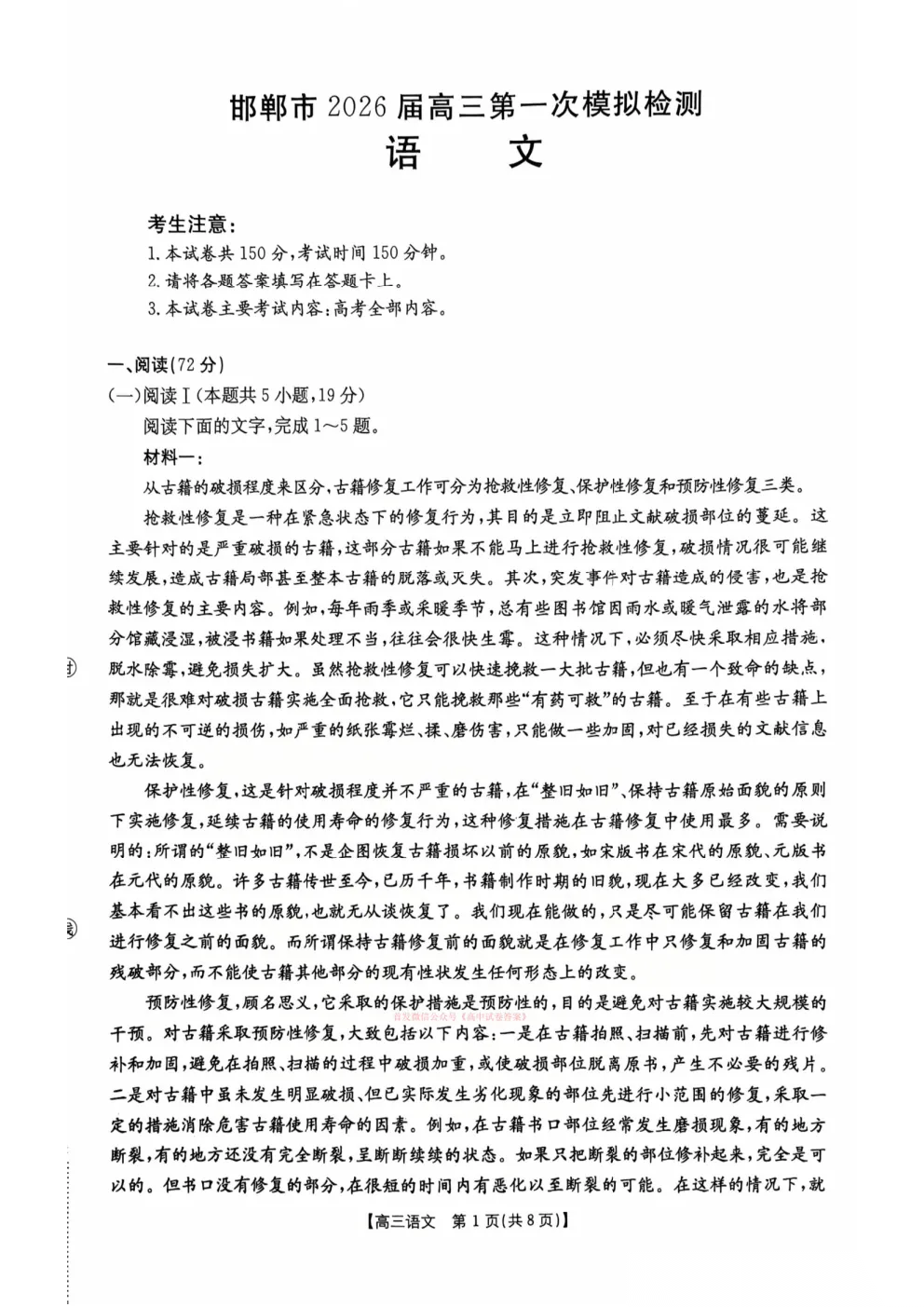 【邯郸一模】邯郸市2026届高三第一次模拟检测下载