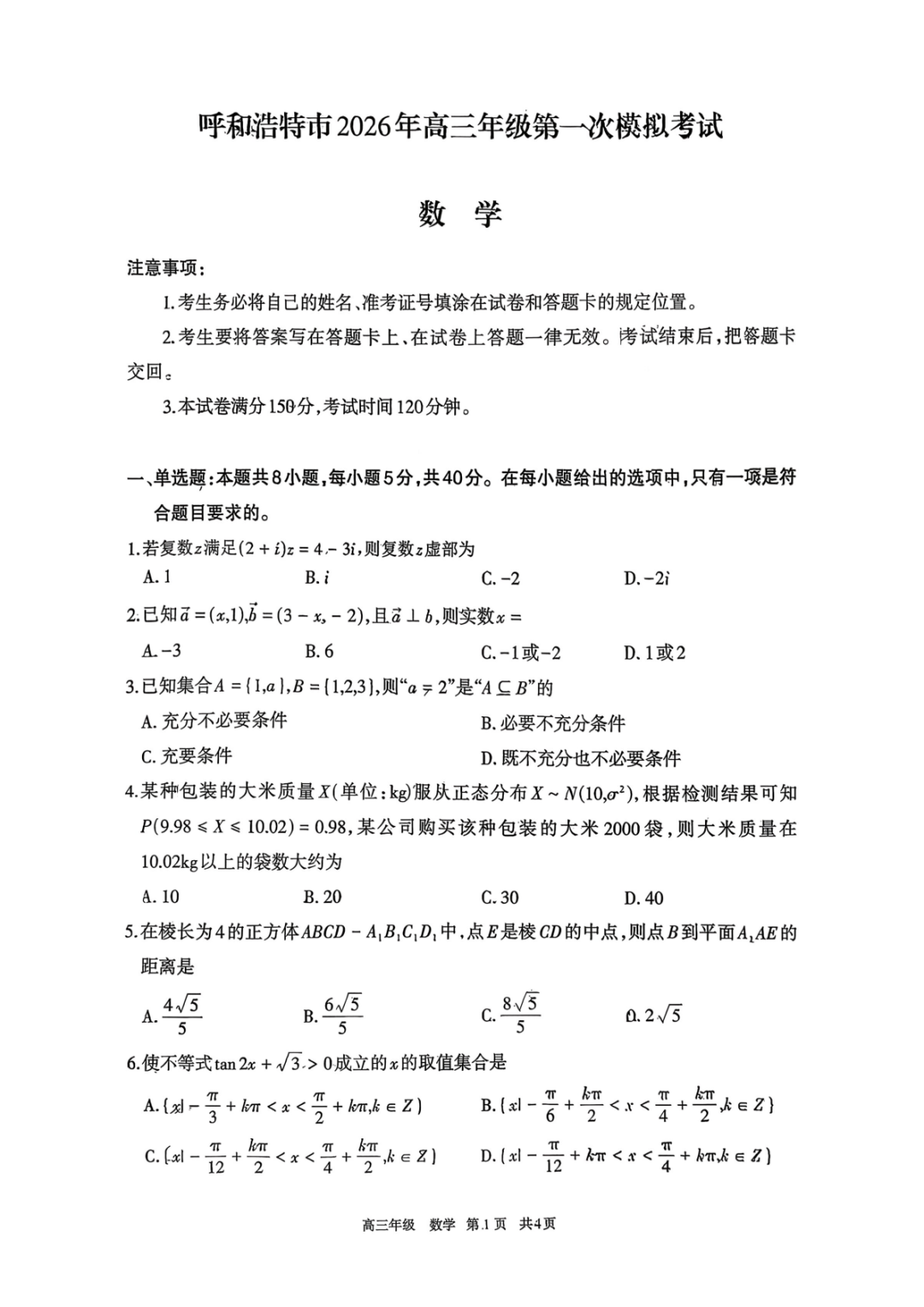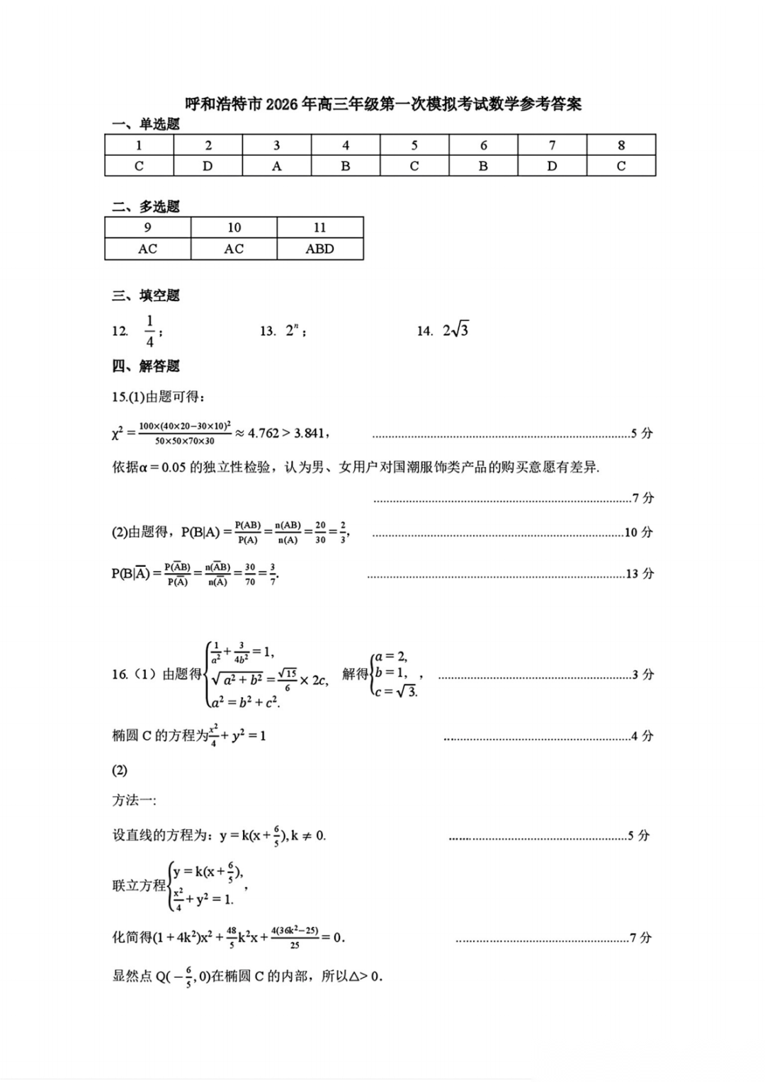 【呼和哈特一模全科】内蒙古自治区呼和浩特市2026年高三年级第一次模拟考试