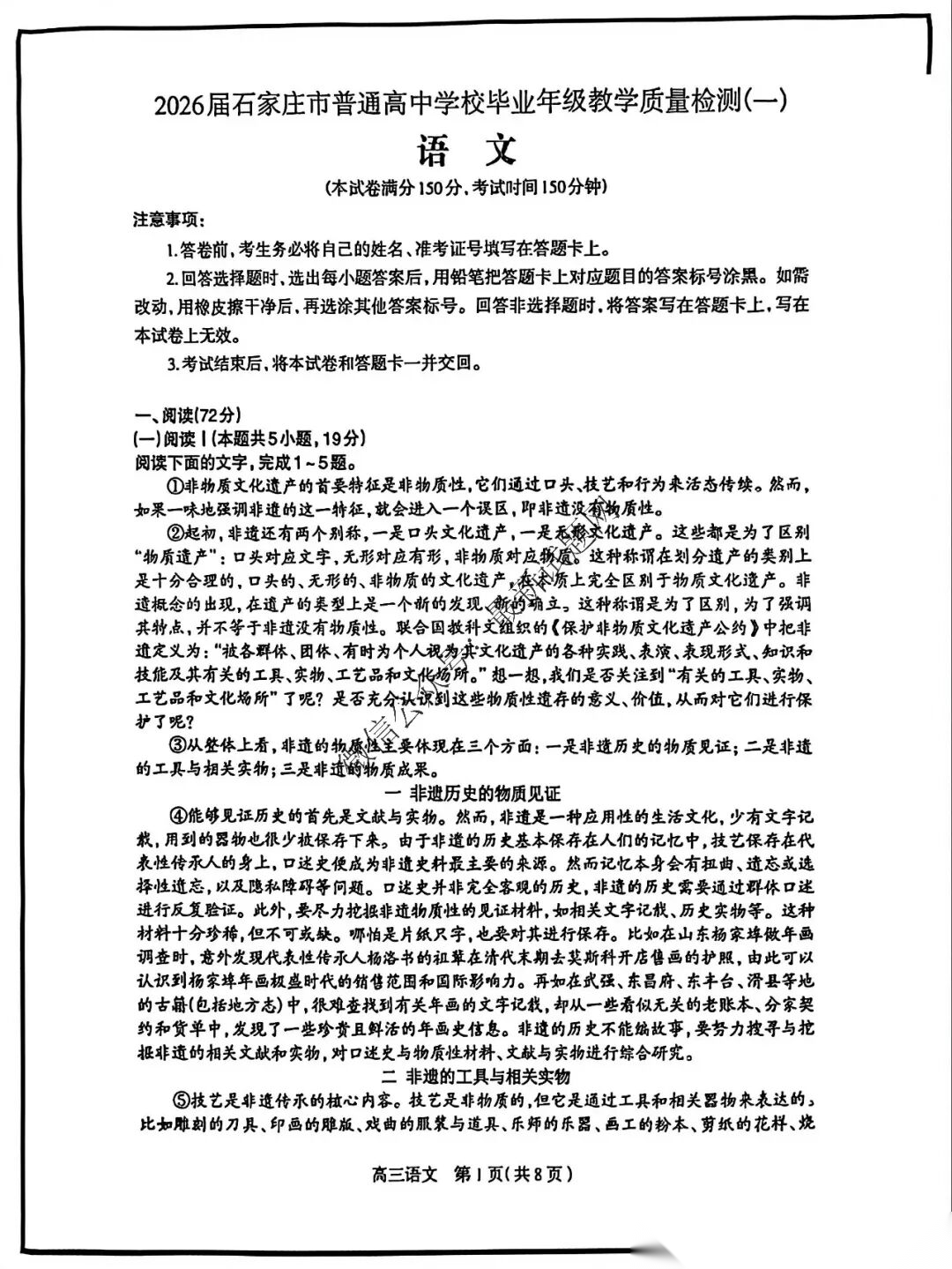 河北省石家庄市2026届普通高中学校毕业年级教学质量检测(一)(石家庄一模)语文试题