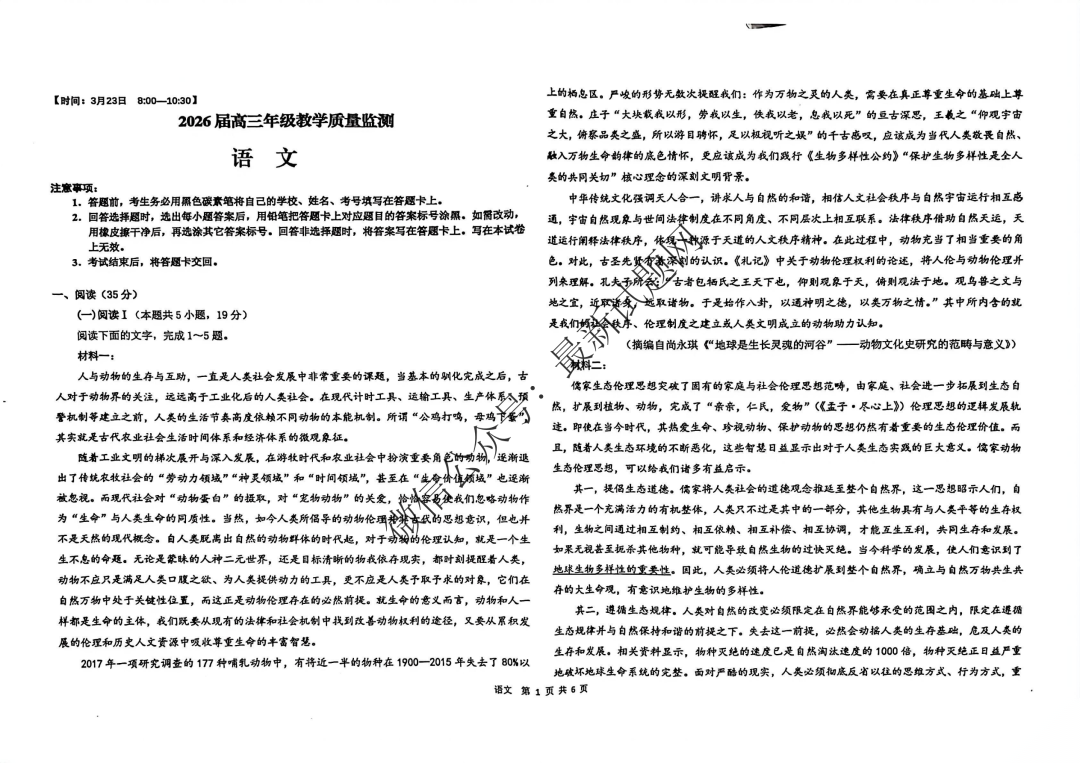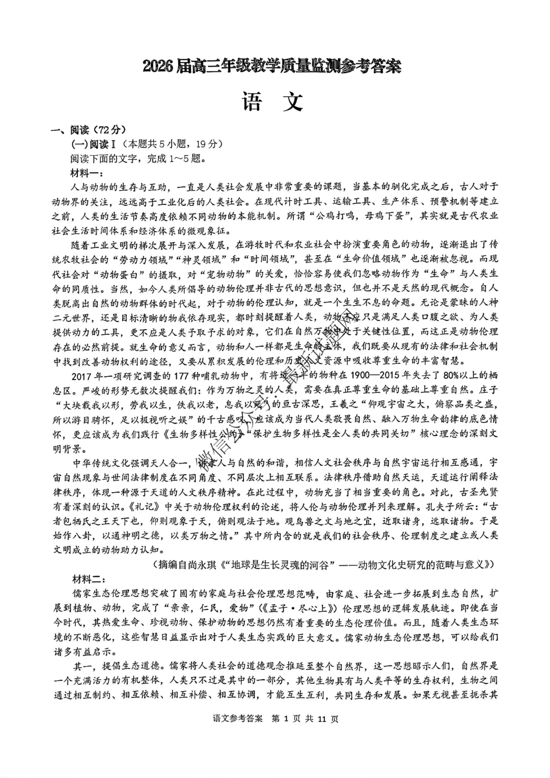 云南省临沧市2026届高三年级教学质量监测3月统测语文