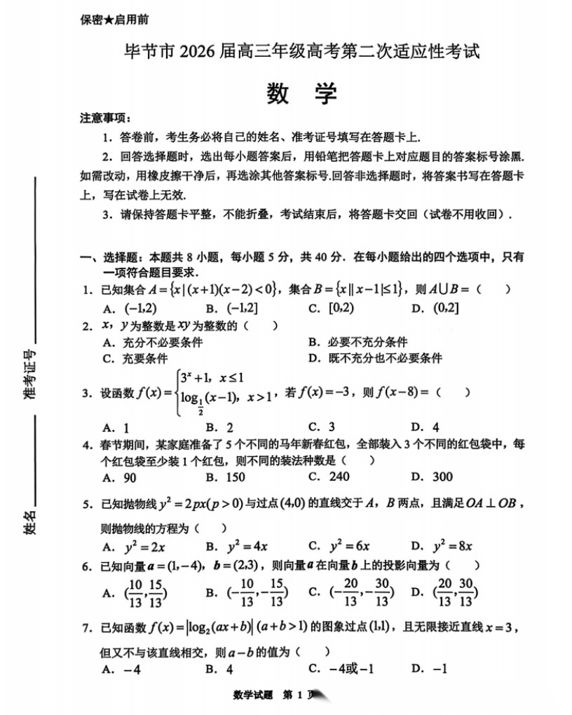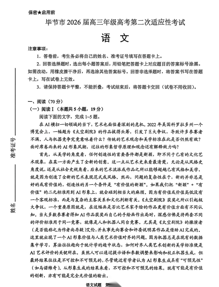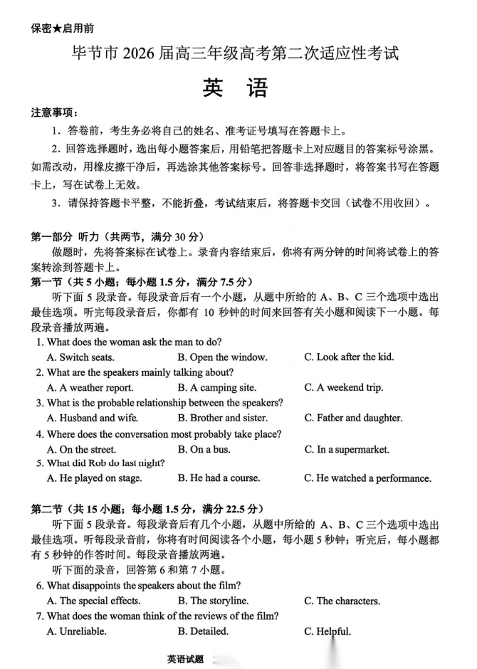 【贵州卷】贵州省毕节市2026届高三年级高考第二次适应性考试(毕节二诊)(3.19-3.20) 全科试题卷+答案
