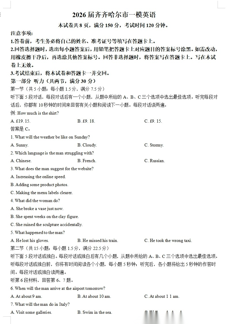 【补齐重发】【黑吉辽蒙卷】黑龙江省2026届齐齐哈尔市高三第一次模拟考试(齐齐哈尔一模)(3.12-3.13) 理科全科试题卷+答案