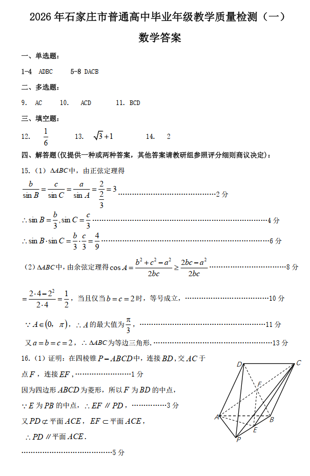 【石家庄一模】2026届石家庄市高三教学质量检测一答案