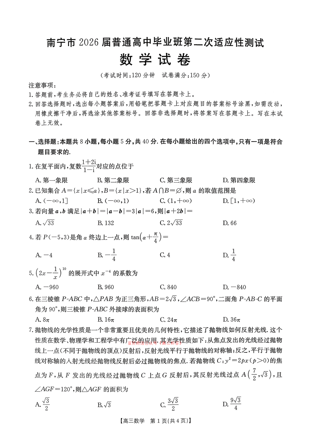 【南宁二模】南宁市2026届高三第二次适应性测试
