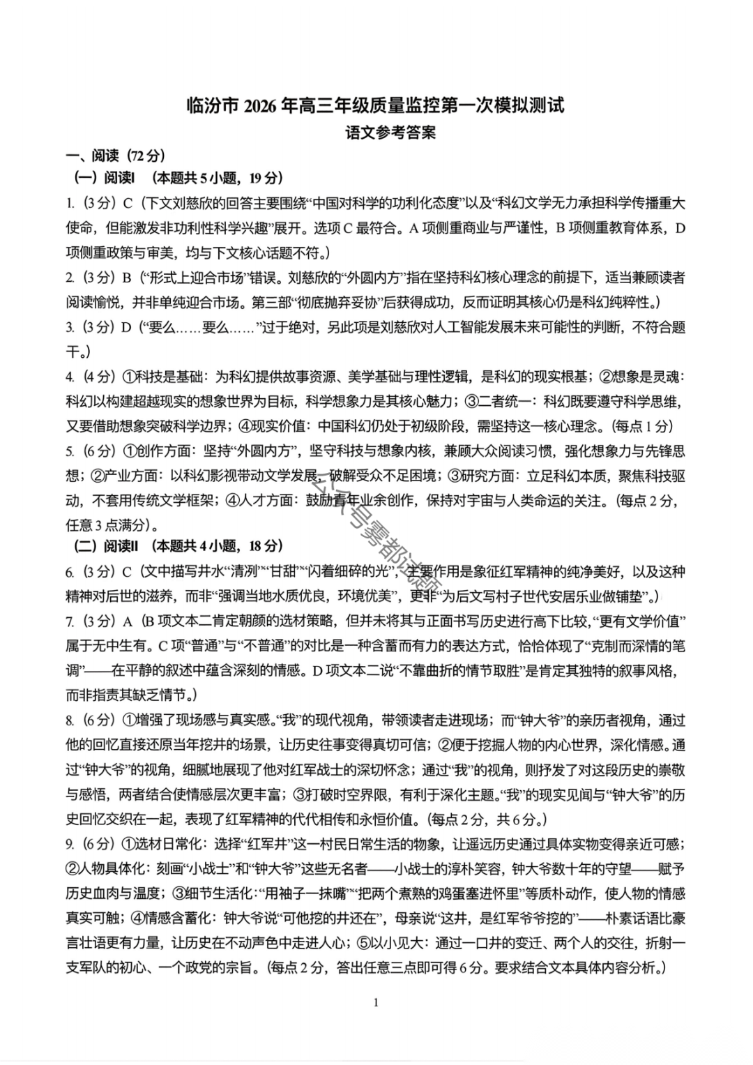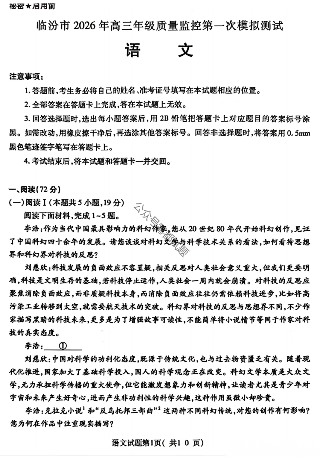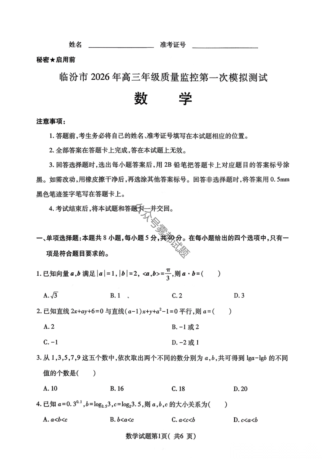 临汾市2026届高三年级质量监控第一次模拟测试(临汾一模)