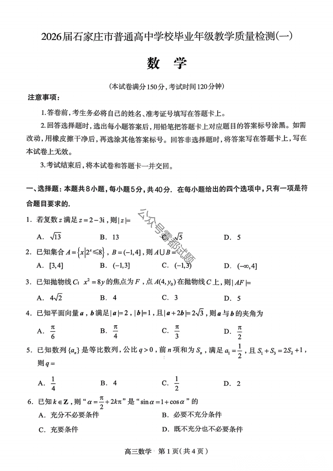 2026届石家庄市普通高中学校毕业年级教学质量检测(一)丨石家庄一模 2026届石家庄市普通高中学校毕业年级教学质量检测(一)丨石家庄一模