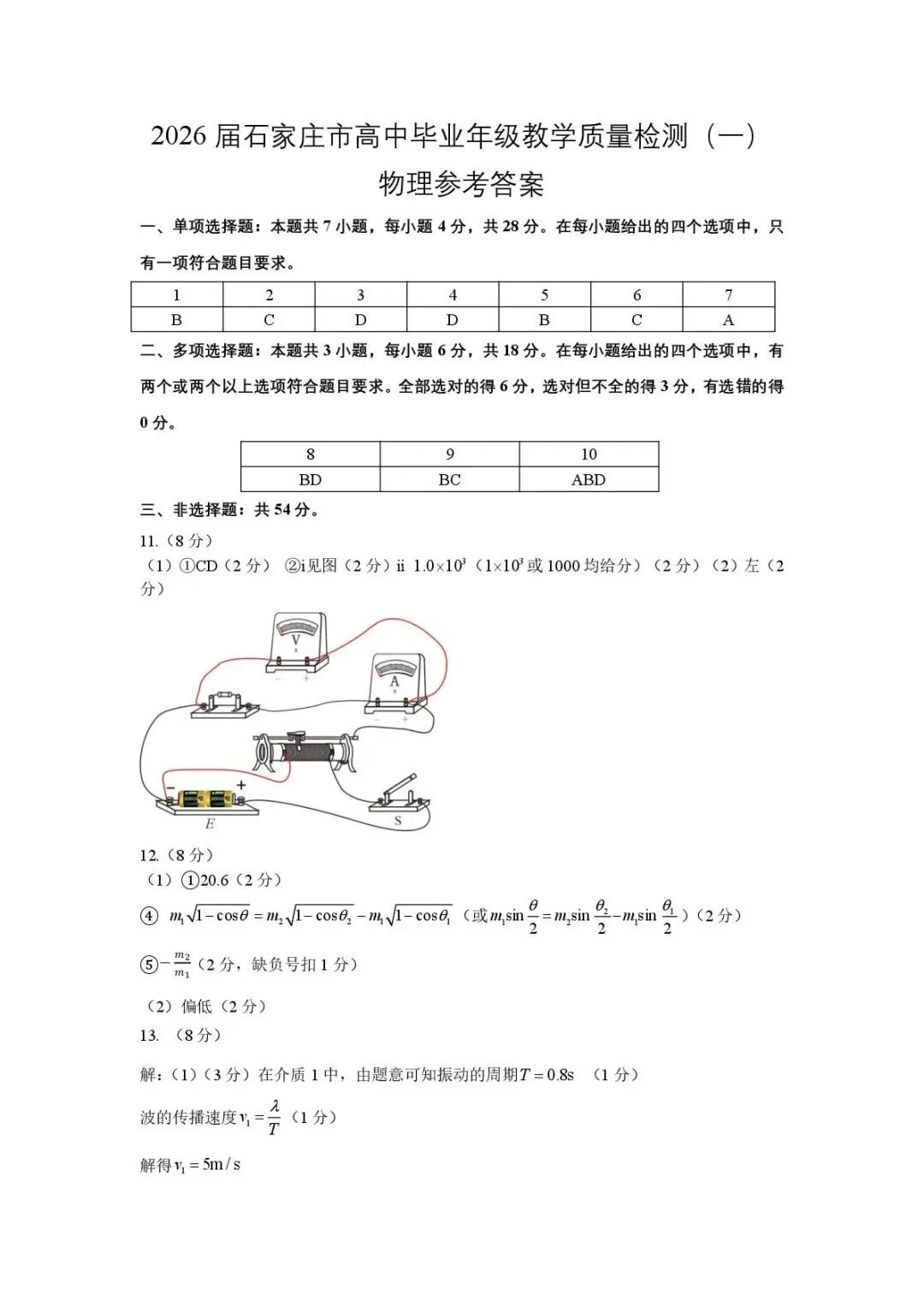 河北省石家庄市2026届普通高中学校毕业年级教学质量检测(一)(石家庄一模)物理